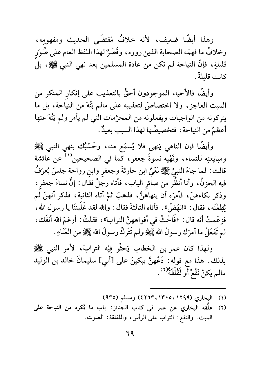وهذا أيضًا ضعيف، لأنه خلافُ مُقتضَى الحديث ومفهومِه، وخلافُ ما فهمَه الصحابة الذين رووه، وقَصْرٌ لهذا اللفظ العام على صُوَرٍ قليلةٍ، فإن النياحة لم تكن من عادة المسلمين بعد نهي النبي صلى الله عليه وسلم، بل كانت قليلةً.