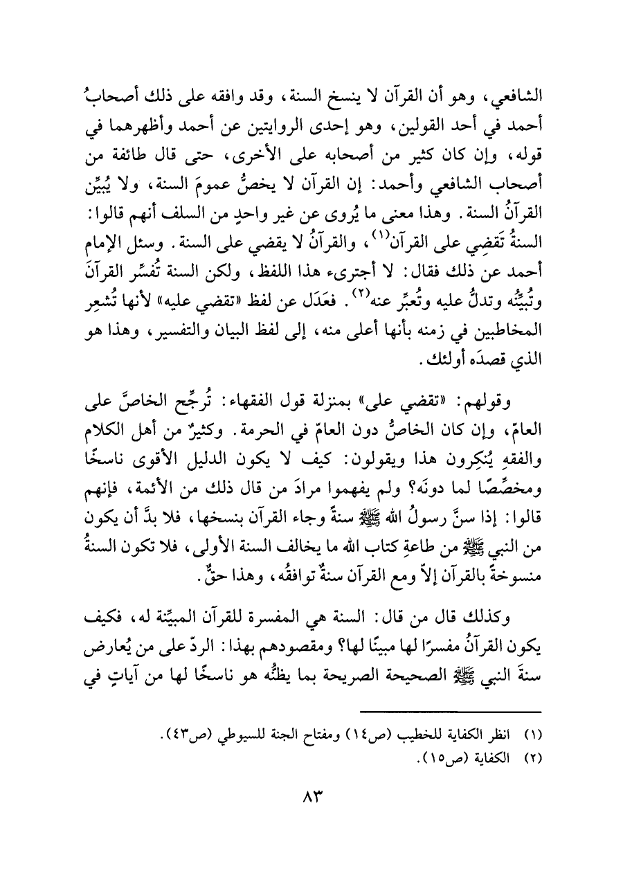 وقولهم: "تقضي على" بمنزلة قول الفقهاء: تُرجِّح الخاصَّ على العامّ، وإن كان الخاصُّ دون العامّ في الحرمة. وكثيرٌ من أهل الكلام والفقهِ يُنكِرون هذا ويقولون: كيف لا يكون الدليل الأقوى ناسخًا ومخصِّصًا لما دونَه؟ ولم يفهموا مرادَ من قال ذلك من الأئمة، فإنهم قالوا: إذا سنَّ رسولُ الله صلى الله عليه وسلم سنةً وجاء القرآن بنسخها، فلا بدَّ أن يكون من النبي صلى الله عليه وسلم من طاعةِ كتاب الله ما يخالف السنة الأولى، فلا تكون السنةُ منسوخةً بالقرآن إلّا ومع القرآن سنةٌ توافقُه، وهذا حقٌّ.