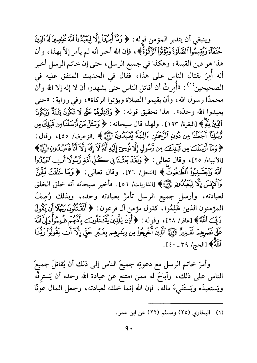 وينبغي أن يتدبر المؤمن قوله: {وَمَا أُمِرُوا إِلَّا لِيَعْبُدُوا اللَّهَ مُخْلِصِينَ لَهُ الدِّينَ حُنَفَاءَ وَيُقِيمُوا الصَّلَاةَ وَيُؤْتُوا الزَّكَاةَ}، فإن الله أخبر أنه لم يأمر إلّا بهذا، وأن هذا هو دين القيمة، وهكذا في جميع الرسل، حتى إن خاتم الرسل أخبر أنه أُمِرَ بقتال الناس على هذا، فقال في الحديث المتفق عليه في الصحيحين (¬١): "أُمِرتُ أن أقاتل الناس حتى يشهدوا أن لا اله إلا الله وأن محمدًا رسول الله، وأن يقيموا الصلاة ويؤتوا الزكاة"، وفي رواية: "حتى يعبدوا الله وحدَه". هذا تحقيق قوله: {وَقَاتِلُوهُمْ حَتَّى لَا تَكُونَ فِتْنَةٌ وَيَكُونَ الدِّينُ لِلَّهِ} [البقرة/ ١٩٣]. ولهذا قال سبحانه: {وَاسْأَلْ مَنْ أَرْسَلْنَا مِن قَبْلِكَ مِن رُّسُلِنَا أَجَعَلْنَا مِن دُونِ الرَّحْمَنِ آلِهَةً يُعْبَدُونَ} [الزخرف/ ٤٥]، وقال: {وَمَا أَرْسَلْنَا مِن قَبْلِكَ مِن رَّسُولٍ إِلَّا نُوحِي إِلَيْهِ أَنَّهُ لَا إِلَهَ إِلَّا أَنَا فَاعْبُدُونِ} [الأنبياء/ ٢٥]، وقال تعالى: {وَلَقَدْ بَعَثْنَا فِي كُلِّ أُمَّةٍ رَّسُولًا أَنِ اعْبُدُوا اللَّهَ وَاجْتَنِبُوا الطَّاغُوتَ} [النحل/ ٣٦]. وقال تعالى: {وَمَا خَلَقْتُ الْجِنَّ وَالْإِنسَ إِلَّا لِيَعْبُدُونِ} [الذاريات/ ٥٦]. فأخبر سبحانه أنه خلق الخلق لعبادته، وأرسل جميع الرسل تأمرُ بعبادته وحده، وبذلك وُصِفَ المؤمنون الذين ظُلِمُوا، كقول مؤمن آل فرعون: {أَتَقْتُلُونَ رَجُلًا أَن يَقُولَ رَبِّيَ اللَّهُ} [غافر/ ٢٨]، وقوله: {أُذِنَ لِلَّذِينَ يُقَاتَلُونَ بِأَنَّهُمْ ظُلِمُوا وَإِنَّ اللَّهَ عَلَى نَصْرِهِمْ لَقَدِيرٌ (٣٩) الَّذِينَ أُخْرِجُوا مِن دِيَارِهِم بِغَيْرِ حَقٍّ إِلَّا أَن يَقُولُوا رَبُّنَا اللَّهُ} [الحج/ ٤٠].