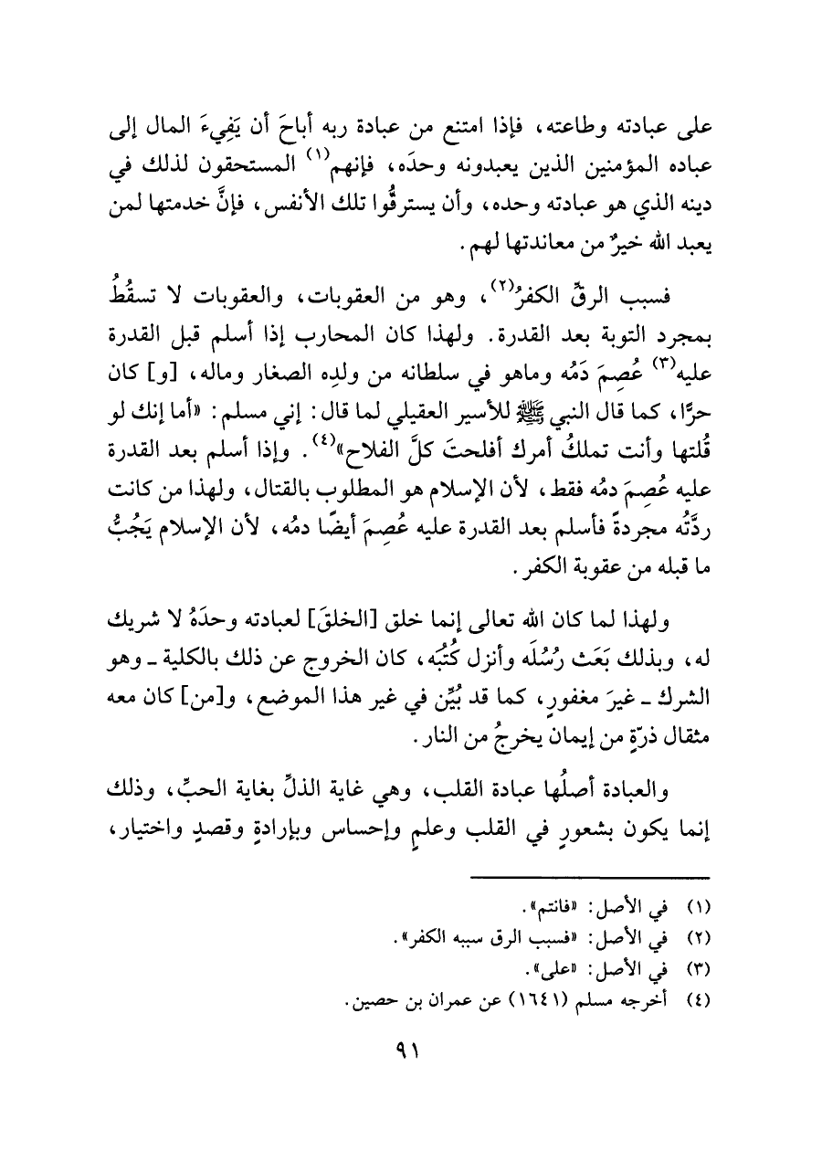 فسبب الرقِّ الكفرُ (¬٢)، وهو من العقوبات، والعقوبات لا تسقُطُ بمجرد التوبة بعد القدرة. ولهذا كان المحارب إذا أسلم قبل القدرة عليه (¬٣) عُصِمَ دَمُه وما هو في سلطانه من ولدِه الصغار وماله، [و] كان حرًّا، كما قال النبي صلى الله عليه وسلم للأسير العقيلي لما قال: إني مسلم: "أما إنك لو قُلتها وأنت تملكُ أمرك أفلحتَ كلَّ الفلاح" (¬٤). وإذا أسلم بعد القدرة عليه عُصِمَ دمُه فقط، لأن الإسلام هو المطلوب بالقتال، ولهذا من كانت ردَّتُه مجردةً فأسلم بعد القدرة عليه عُصِمَ أيضًا دمُه، لأن الإسلام يَجُبُّ ما قبله من عقوبة الكفر.