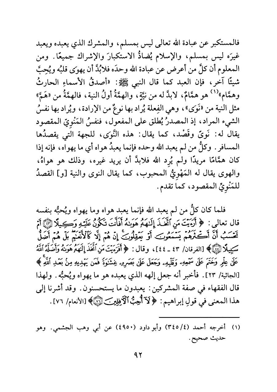 فالمستكبر عن عبادة الله تعالى ليس بمسلم، والمشرك الذي يعبده ويعبد غيرَه ليس بمسلم، والإسلام يُضادُّ الاستكبارَ والإشراك جميعًا. ومن المعلوم أن كلَّ من أعرض عن عبادة الله وحدَه فلا بُدَّ أن يهوَى قلبُه ويُحِبَّ شيئًا آخر، فإن العبد كما قال النبي صلى الله عليه وسلم: "أصدقُ الأسماءِ الحارثُ وهمَّام" (¬١) هو همَّامٌ، لا بدَّ له من نيَّةٍ، والهمَّةُ أولُ النية، فالهمَّةُ من "هَمَّ" مثل النية من "نَوَى"، وهي الفِعلة يُراد بها نوعٌ من الإرادة، ويُراد بها نفسُ الشيء المراد، إذ المصدرُ يُطلق على المفعول، فنفسُ المَنْوِيّ المقصود يقال له: نَوًى وقَصْد، كما يقال: هذه النَّوَى، للجهة التي يقصدُها المسافر. وكلُّ من لم يعبد الله وحده فإنما يعبدُ هواه أي ما يهواه، فإنه إذا كان همَّامًا مريدًا ولم يُرِد الله فلا بدَّ أن يريد غيره، وذلك هو هواهُ، والهوى يقال له المَهْوِيُّ المحبوب، كما يقال النوى والنية [و] القصدُ للمَنْوِيِّ المقصود، كما تقدم.