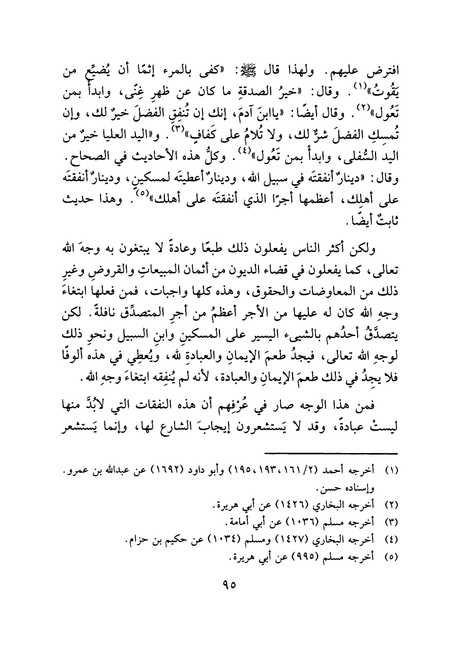 افترض عليهم. ولهذا قال صلى الله عليه وسلم: "كفى بالمرء إثمًا أن يُضيِّع من يَقُوتُ" (¬١). وقال: "خيرُ الصدقةِ ما كان عن ظهرِ غِنًى، وابدأْ بمن تَعُول" (¬٢). وقال أيضًا: "يا ابنَ آدمَ، إنك إن تُنفِقِ الفضلَ خيرٌ لك، وإن تُمسِكِ الفضلَ شرٌّ لك، ولا تُلامُ على كَفافٍ" (¬٣). و "اليد العليا خيرٌ من اليد السُّفلى، وابدأْ بمن تَعُول" (¬٤). وكلُّ هذه الأحاديث في الصحاح. وقال: "دينارٌ أنفقتَه في سبيل الله، ودينارٌ أعطيتَه لمسكينٍ، ودينارٌ أنفقتَه على أهلِك، أعظمها أجرًا الذي أنفقتَه على أهلك" (¬٥). وهذا حديث ثابتٌ أيضًا.