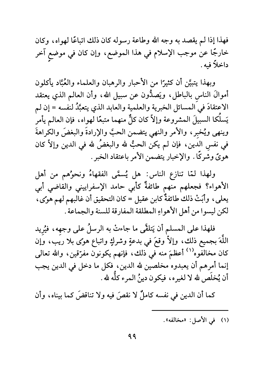وبهذا يتبيَّن أن كثيرًا من الأحبار والرهبان والعلماء والعُبَّاد يأكلون أموالَ الناسِ بالباطل، ويَصدُّون عن سبيل الله، وأن العالم الذي يعتقد الاعتقادَ في المسائل الخبرية والعلمية والعابد الذي يتعبَّدُ لنفسه = إن لم يَسلُكا السبيلَ المشروعة وإلّا كان كلٌّ منهما متبعًا لهواه، فإن العالم يأمر وينهى ويُخبِر، والأمر والنهي يتضمن الحبَّ والإرادةَ والبغضَ والكراهةَ في نفسِ الدين، فإن لم يكن الحبُّ لله والبغضُ لله في الدين وإلّا كان هوًى وشركًا. والإخبار يتضمن الأمر باعتقاد الخبر.