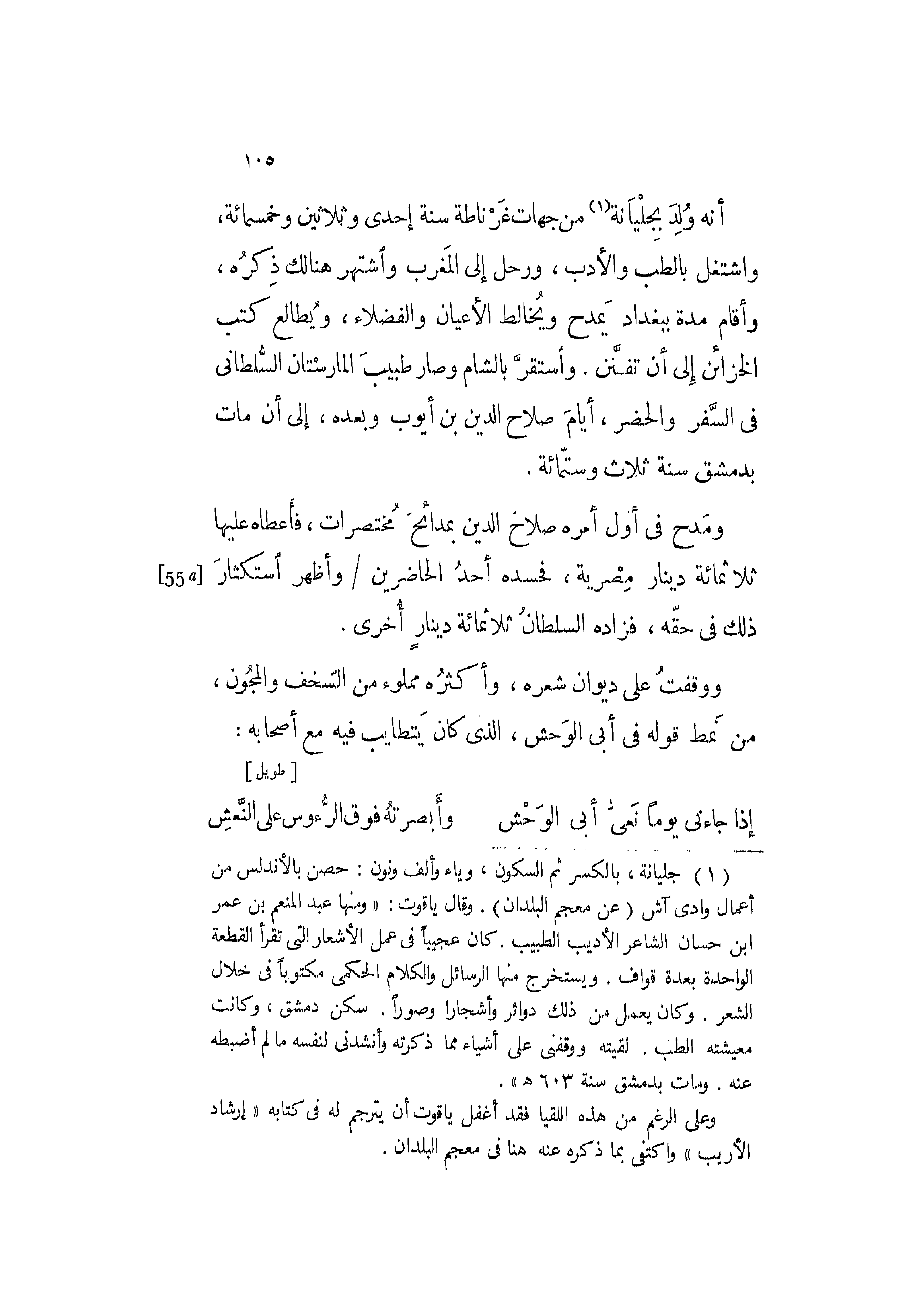 أنه ولد بجليانه من جهات غرناطة سنة إحدى وثلاثين وخمسمائة، واشتغل بالطب والأدب، ورحل إلى المغرب واشتهر هناك ذكره، وأقام مدة ببغداد يمدح ويخالط الأعيان والفضلاء، ويطالع كتب الخزائن إلى أن المتفنن. واستقر بالشام وصار طبيب المارستان السلطاني في السفر والحضر، أيام صلاح الدين بن أيوب وبعده، إلى أن مات بدمشق سنة ثلاث وستمائة.