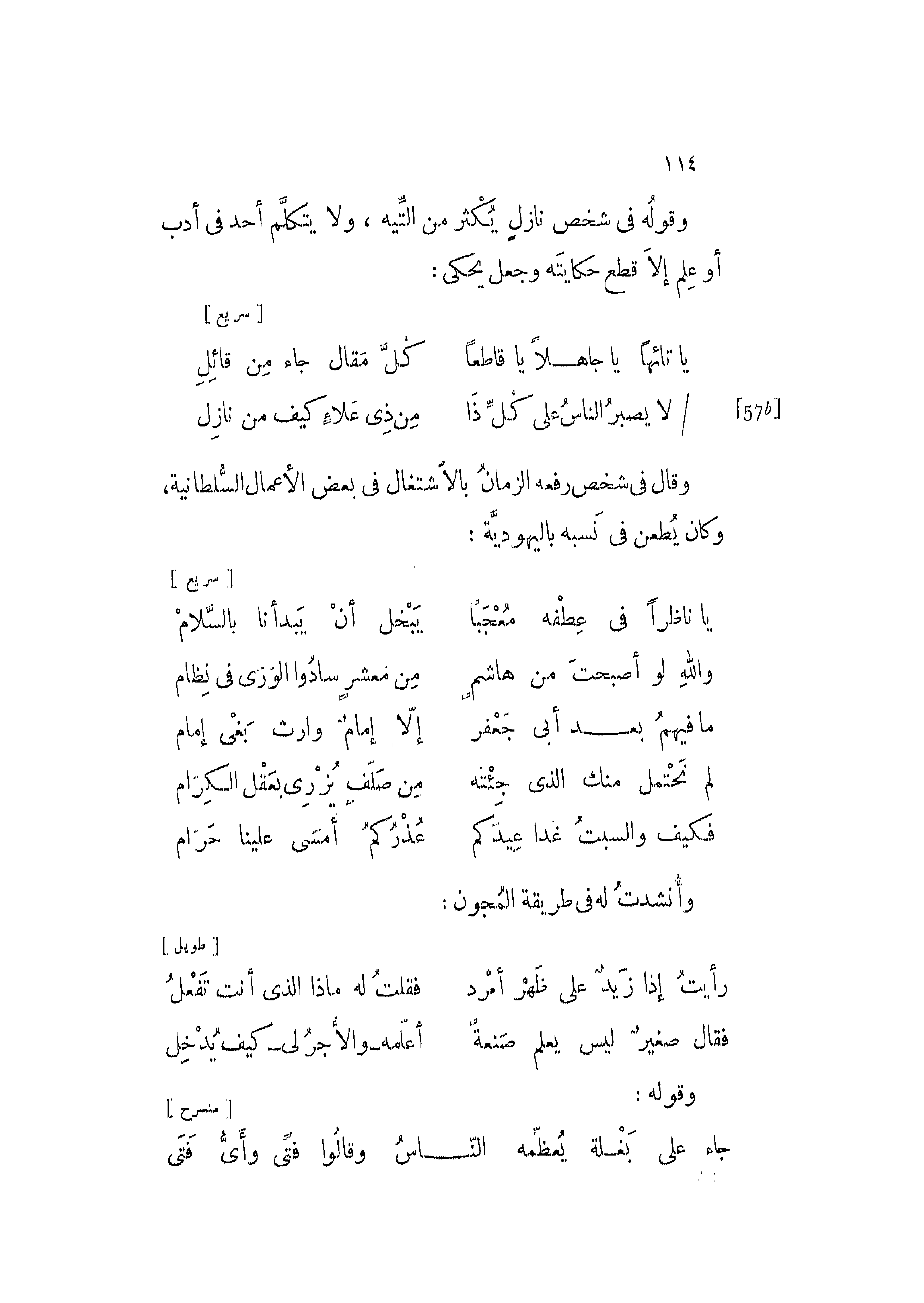 وقوله في شخص نازلٍ يكثر من التيه، ولا يتكلم أحد في أدب أو علم إلا قطع حكايته وجعل يحكي: