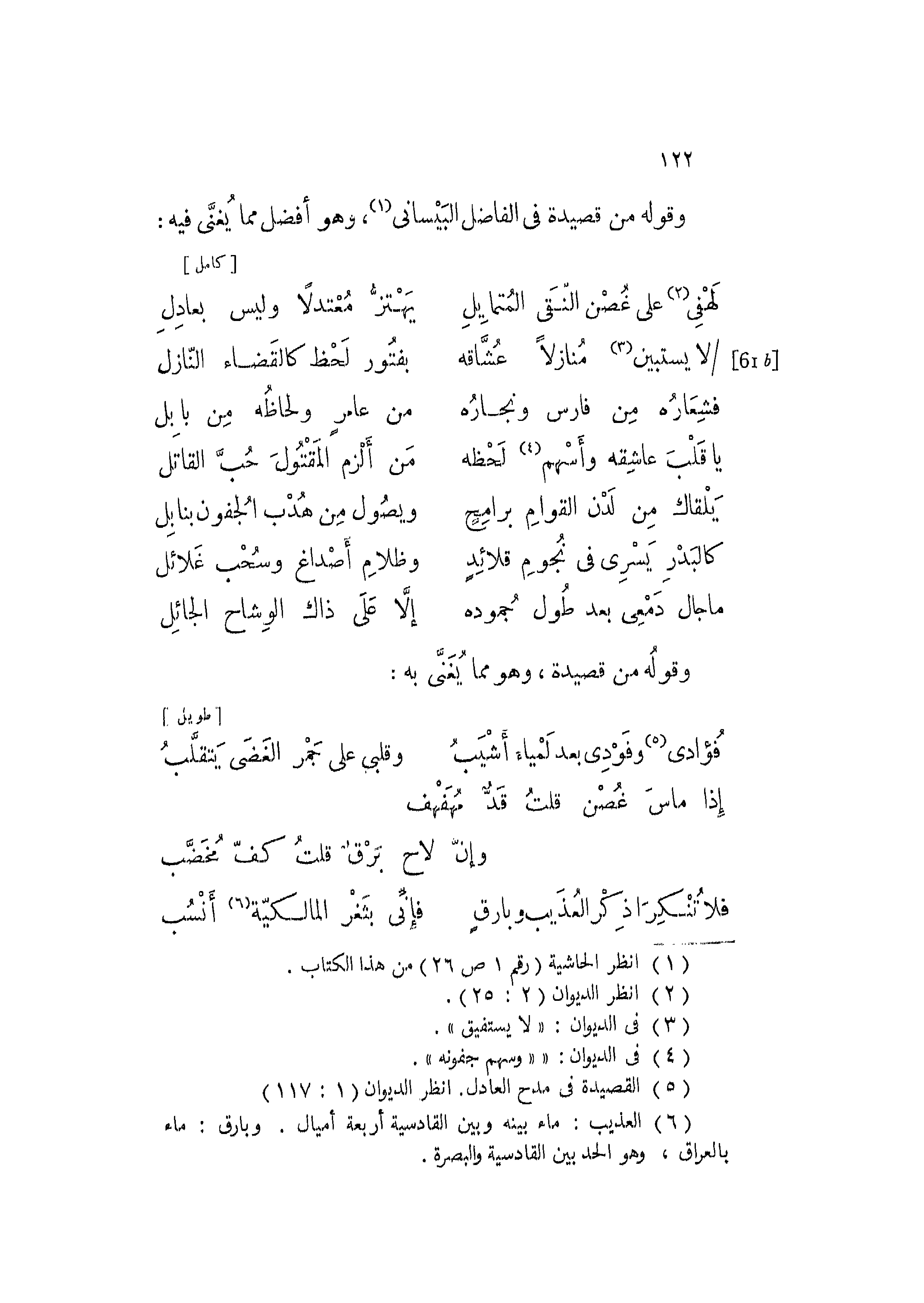 وقوله في قصيدة في الفاضل البيساني، وهو أفضل مما يغني فيه: