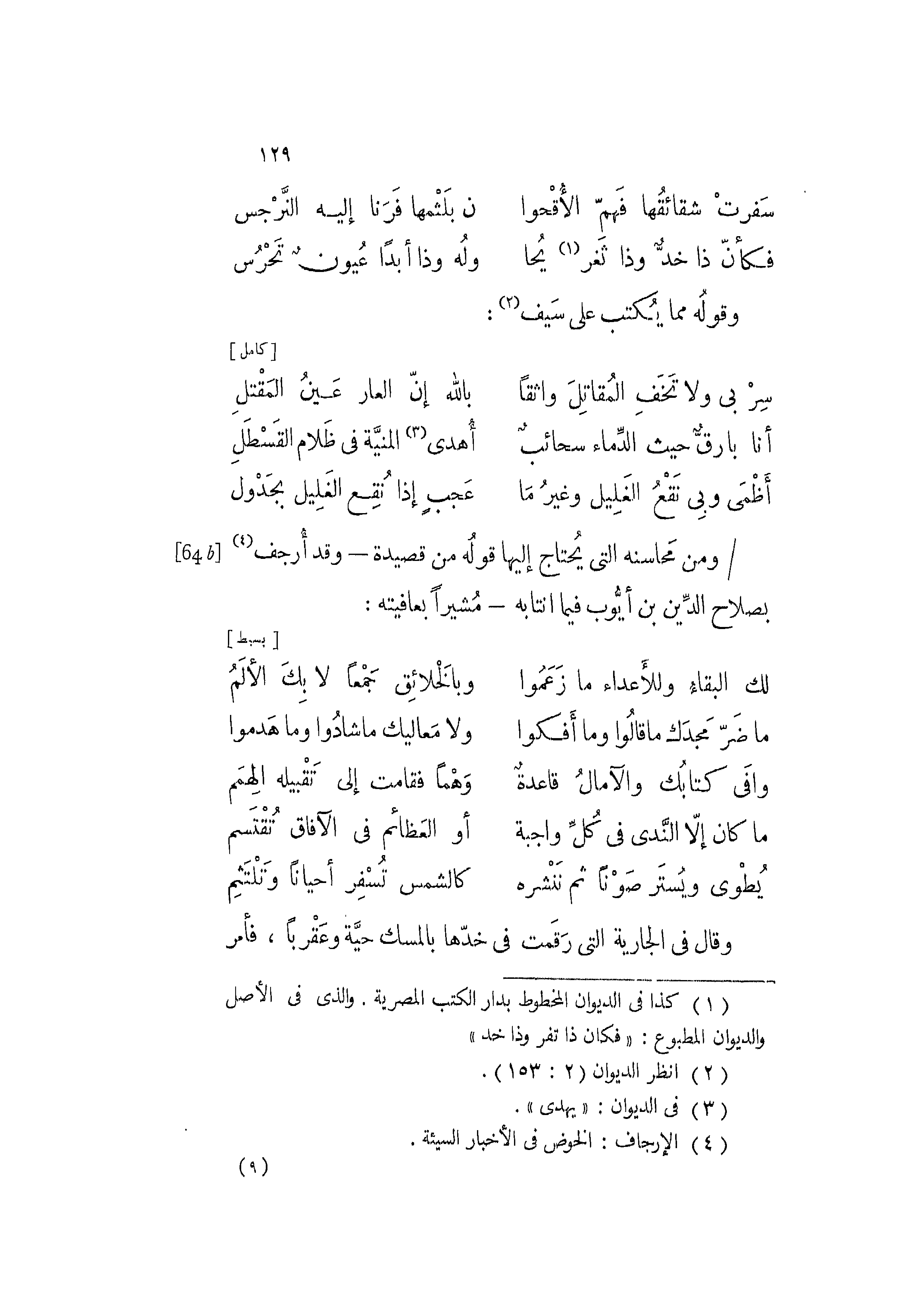 ومن محاسنه التي يحتاج إليها قوله من قصيدة -وقد أرجف بصلاح الدين أيوب فيما انتابه- مشيرا بعافيته: