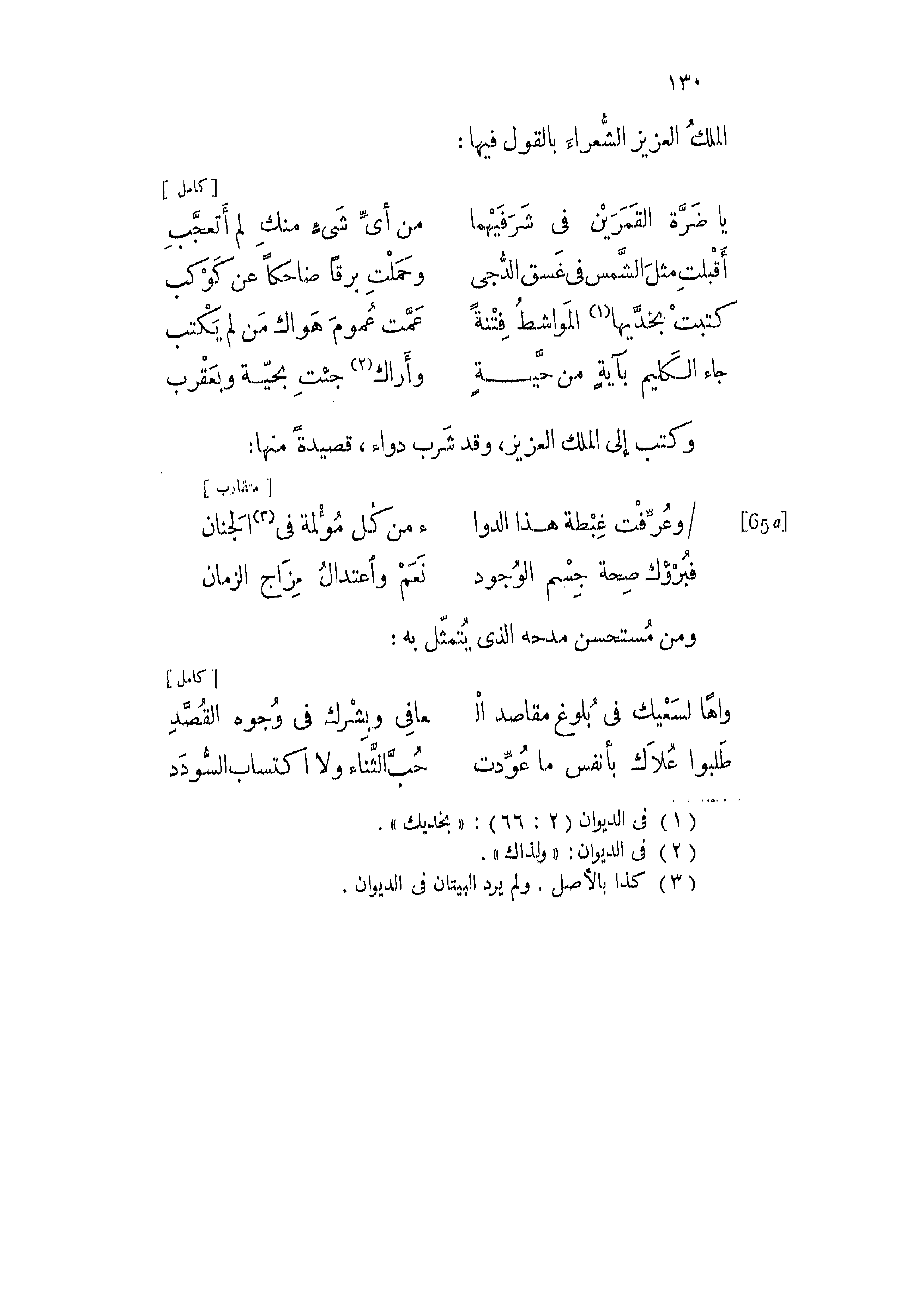 وكتب إلى الملك العزيز، وقد شرب دواء، قصيدة منها: