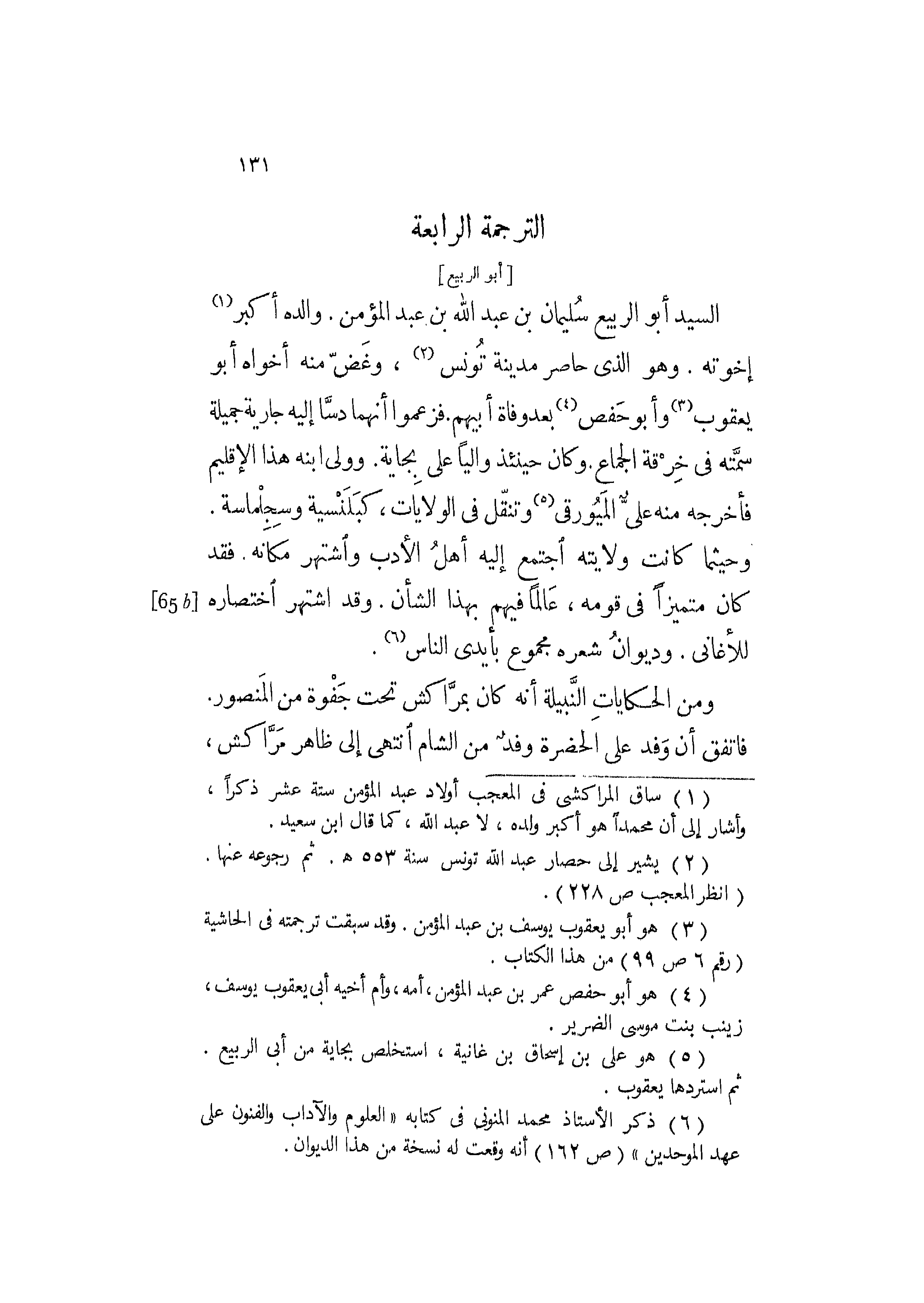 السيد المتفنن أبو الربيع سليمان بن عبد الله بن المؤمن. والده أكبر إخوته. وهو الذي حاصر مدينة تونس، وغض منه أخواه أبو يعقوب وأبو حفص، بعد وفاة أبيهم فزعموا أنهما دسا إليه جارية جميلة سمته في خرقة الجماع. وكان حينئذ واليا على بجاية. وولى ابنه هذا الإقليم فأخرجه منه على اليورقي وتنقل في الولايات، كبلنسية وسجلماسة. وحيثما كانت ولايته اجتمع إليه أهل الأدب واشتهر مكانه. فقد كان متميزا في قومه، عالما فيهم بهذا الشأن. وقد اشتهر اختصاره للأغاني. وديوان شعره مجموع بأيدي الناس. ومن الحكايات النبيلة أنه كان بمراكش تحت جفوة من المنصور. فاتفق أن وفد على الحضرة وفد من الشام انتهى إلى ظاهر مراكش،