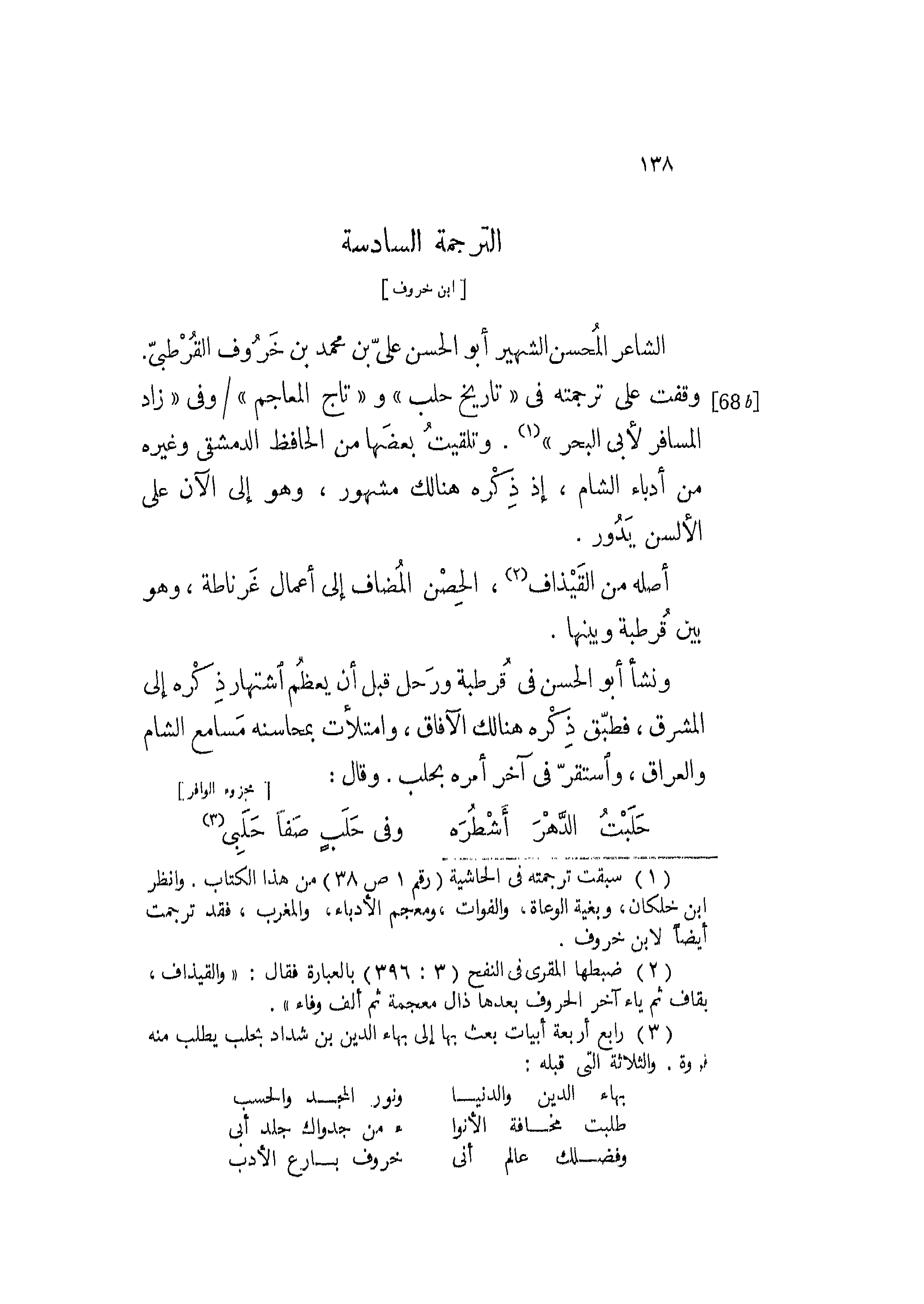 الشاعر المحسن الشهير أبو الحسن علي بن محمد بن خروف القرطبي. وقفت على ترجمته في "تاريخ حلب" و"تاريخ المعاجم" وفي "زاد المسافر لأبي البحر". وتلقيت بعضها من الحافظ الدمشقي وغيره من أدباء الشام، إذ ذكره هناك مشهور، وهو إلى الآن على الألسن يدور.
