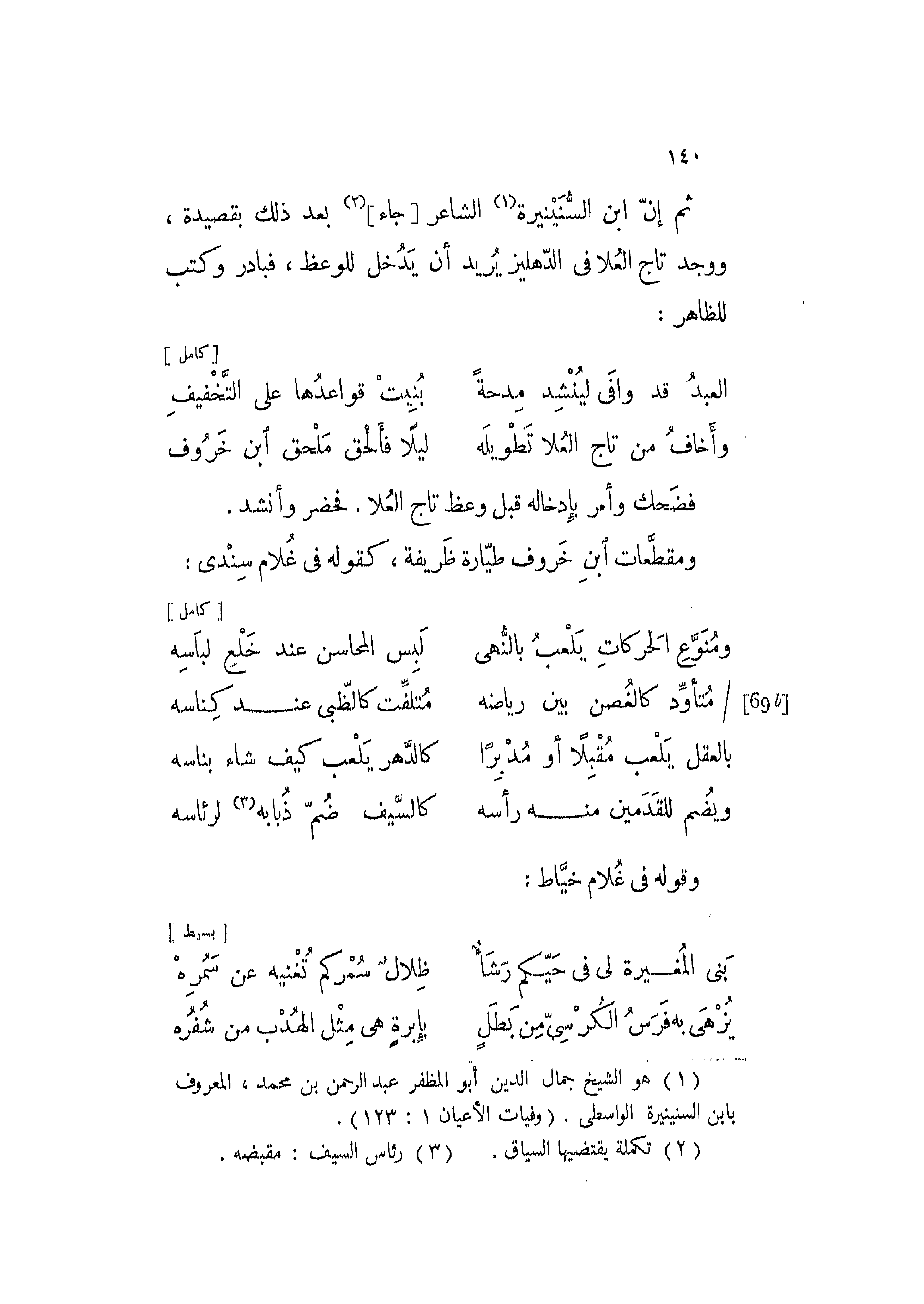 ثم إن ابن السنينرة الشاعر [جاء] بعد ذلك بقصيدة، ووجد تاج العلا في الدهليز يريد أن يدخل للوعظ، فبادر وكتب للظاهر: