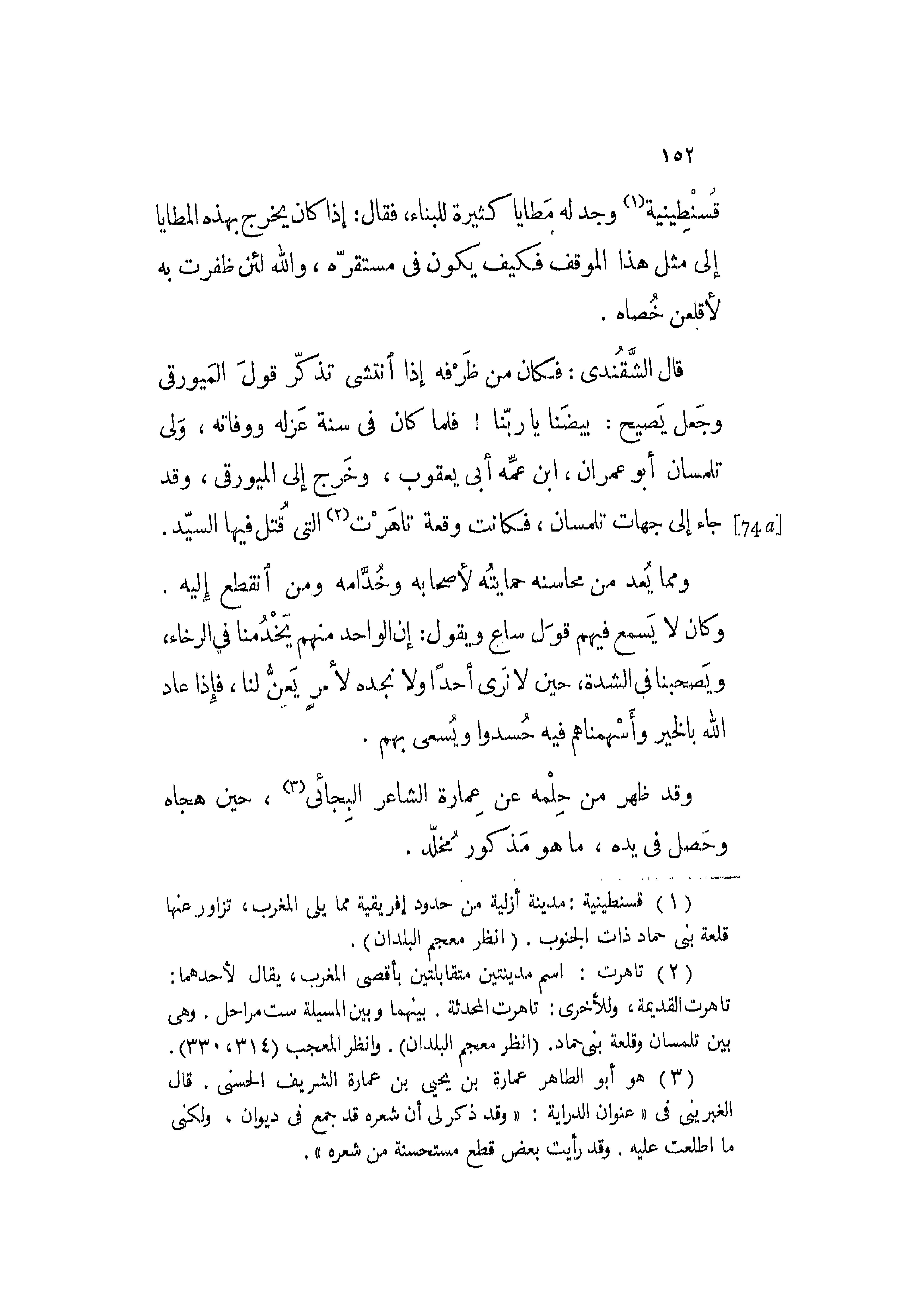 قسطنينية جد له مطايا كثيرة للبناء، فقال: إذا كان يخرج بهذه المطايا إلى مثل هذا الموقف فكيف يكون في مستقره، والله لئن ظفرت به لأقلعن خصاه.