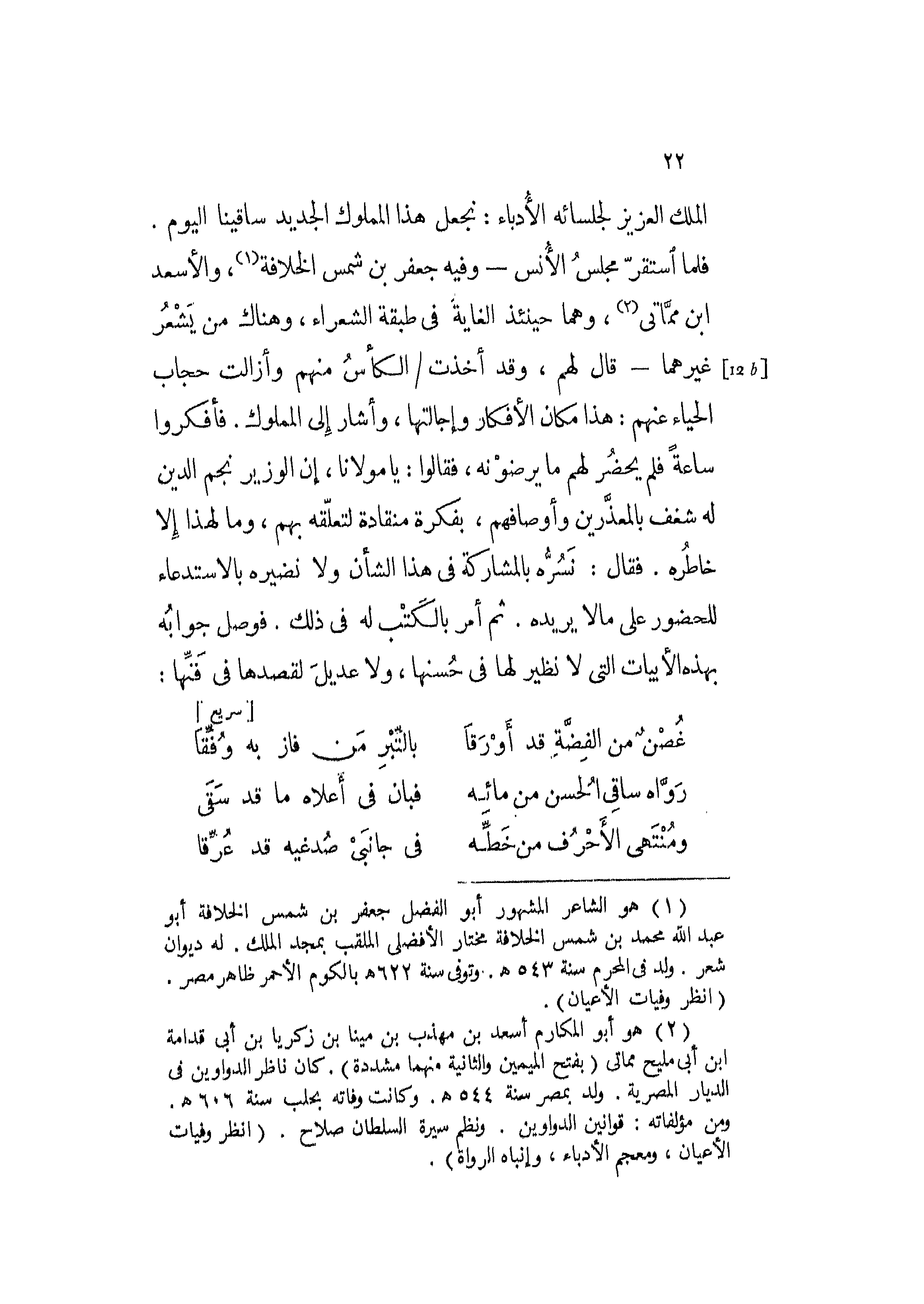 الملك العزيز لجلسائه الأدباء: نجعل هذا المملوك الجديد ساقينا اليوم. فلما استقر مجلس الأنس- وفيه جعفر بن شمس الخلافة، والأسعد ابن مماتي، وهما حينئذ الغاية في طبقة الشعراء، وهناك من يشعر غيرهما- قال لهم، وقد أخذت الكأس منهم وأزلت حجاب الحياء عنهم: هذا مكان الأفكار وإجالتها، وأشار إلى المملوك. فأفكروا ساعةً فلم يحضر لهم ما يرضونه، فقالوا: يا مولانا، إن الوزير نجم الدين له شغف بالمعذرين وأوصافهم، بفكرة منقادة لتعلقه بهم، وما لهذا إلا خاطره. فقال: نسره بالمشاركة في هذا الشأن ولا نضيره بالاستدعاء للحضور على ما لا يريده. ثم أمر بالكتب له في ذلك. فوصل جوابه بهذه الأبيات التي لا نظير لها في حسنها، ولا عديل لقصدها في فنها: