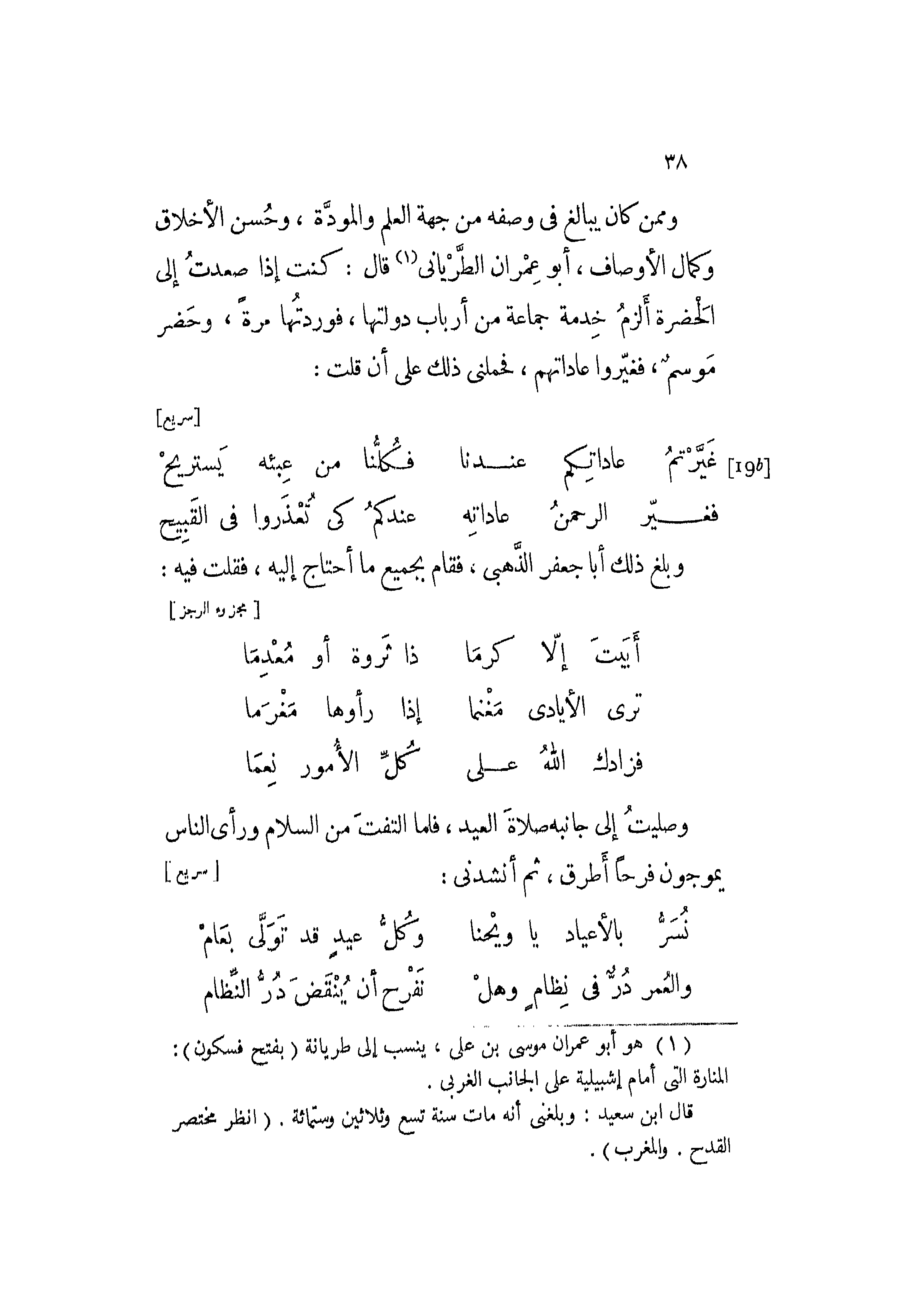 وممن كان يبالغ في وصفه من جهة العلم والمودة، وحسن الأخلاق وكمال الأوصاف، أبو عمران الطرياني قال: كنت إذا صعدت إلى الحضرة ألزم خدمة جماعة من أرباب دولتها، فوردتها مرةً، وحضر موسم، فغيروا عاداتهم، فحملني ذلك على أن قلت: