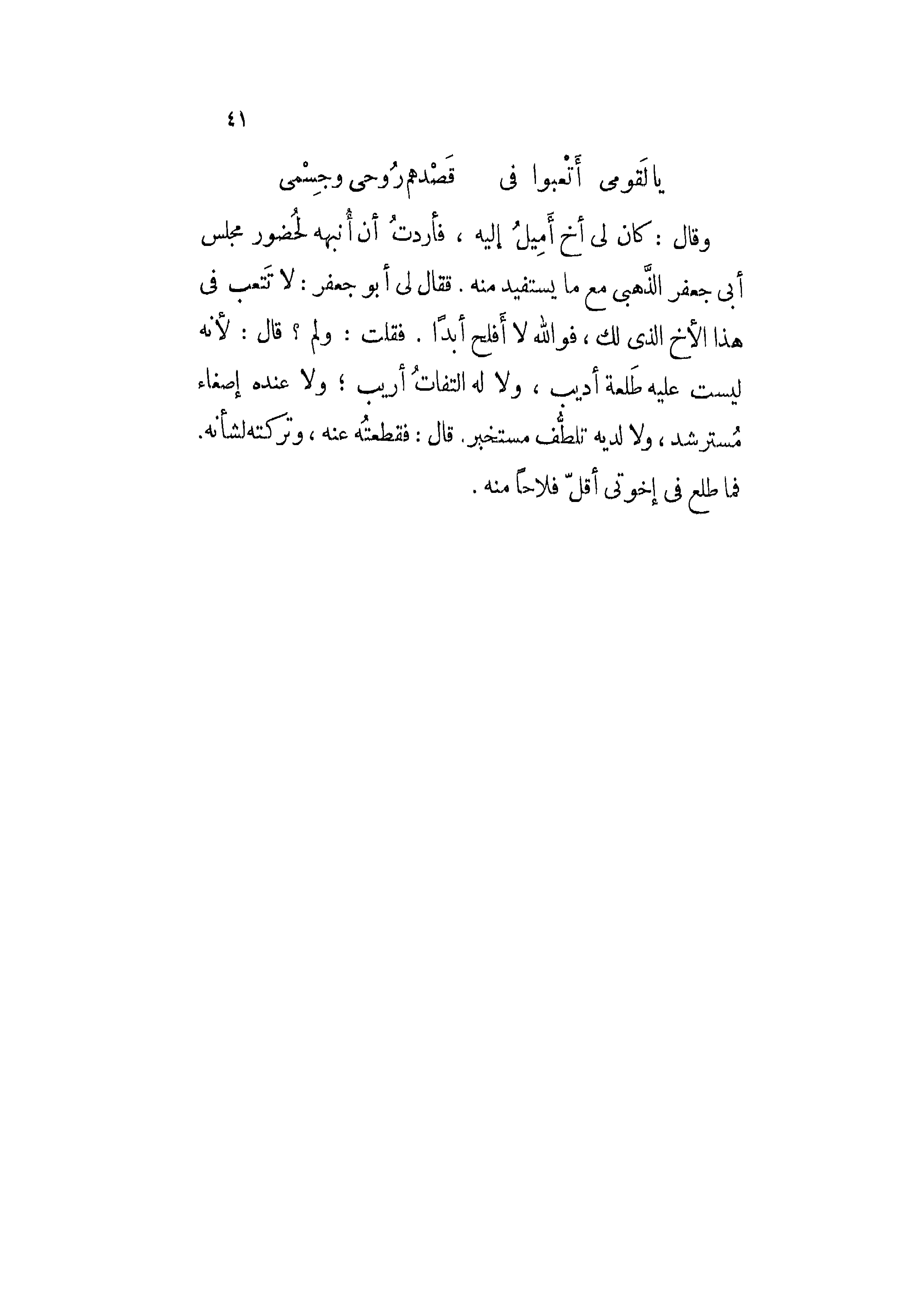 وقال: كان لي أخ أميل إليه، فأردت أن أنبهه لحضور مجلس أبي جعفر الذهبي مع ما يستفيد منه. فقال لي أبو جعفر: لا تتعب في هذا الأخ الذي لك، فو الله لا أفلح أبداً. فقلت: ولم؟ قال: لأنه ليست عليه طليعة أديب، ولا له التفات أريب، ولا عنده إصغاء مسترشد، ولا لديه تلطف مستخبر. قال: فقطعه عنه، وتركته لشأنه0فما طلع في إخوتي أقل فلاحاً منه.
