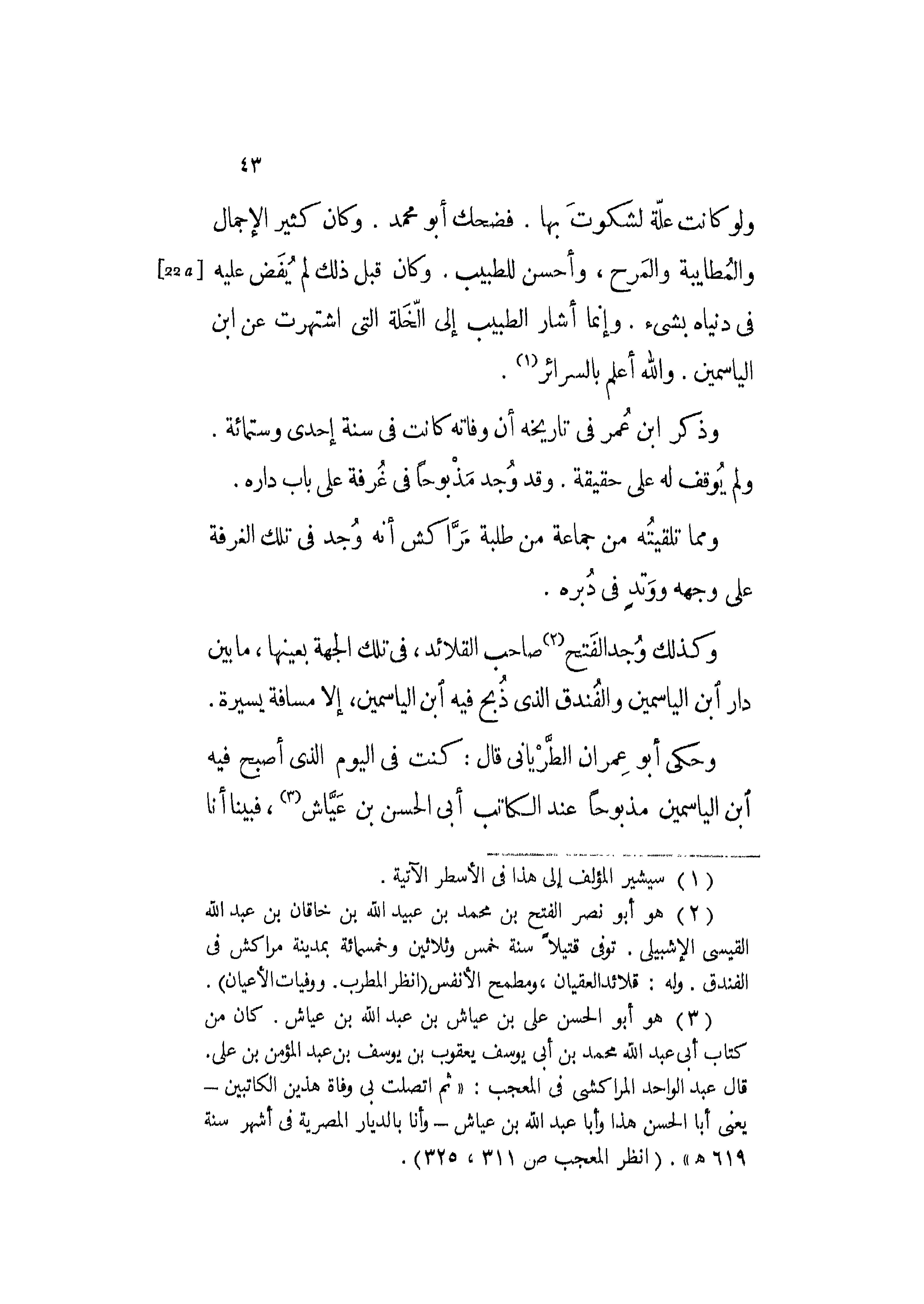 وذكر ابن عمر في تاريخه أن وفاته كانت في سنة إحدى وستمائة. ولم يوقف له على الحقيقة. وقد وجد مذبوحا في غرفة على باب داره. ومما تلقيته من جماعة من طلبة مراكش أنه وجد في تلك الغرفة على وجهه ووتد في دبره. وكذلك وجد الفتح صاحب القلائد، في تلك الجهة بعينها، ما بين دار ابن الياسمين والفندق الذي ذبح فيه ابن الياسمين، إلا مسافة يسيرة.