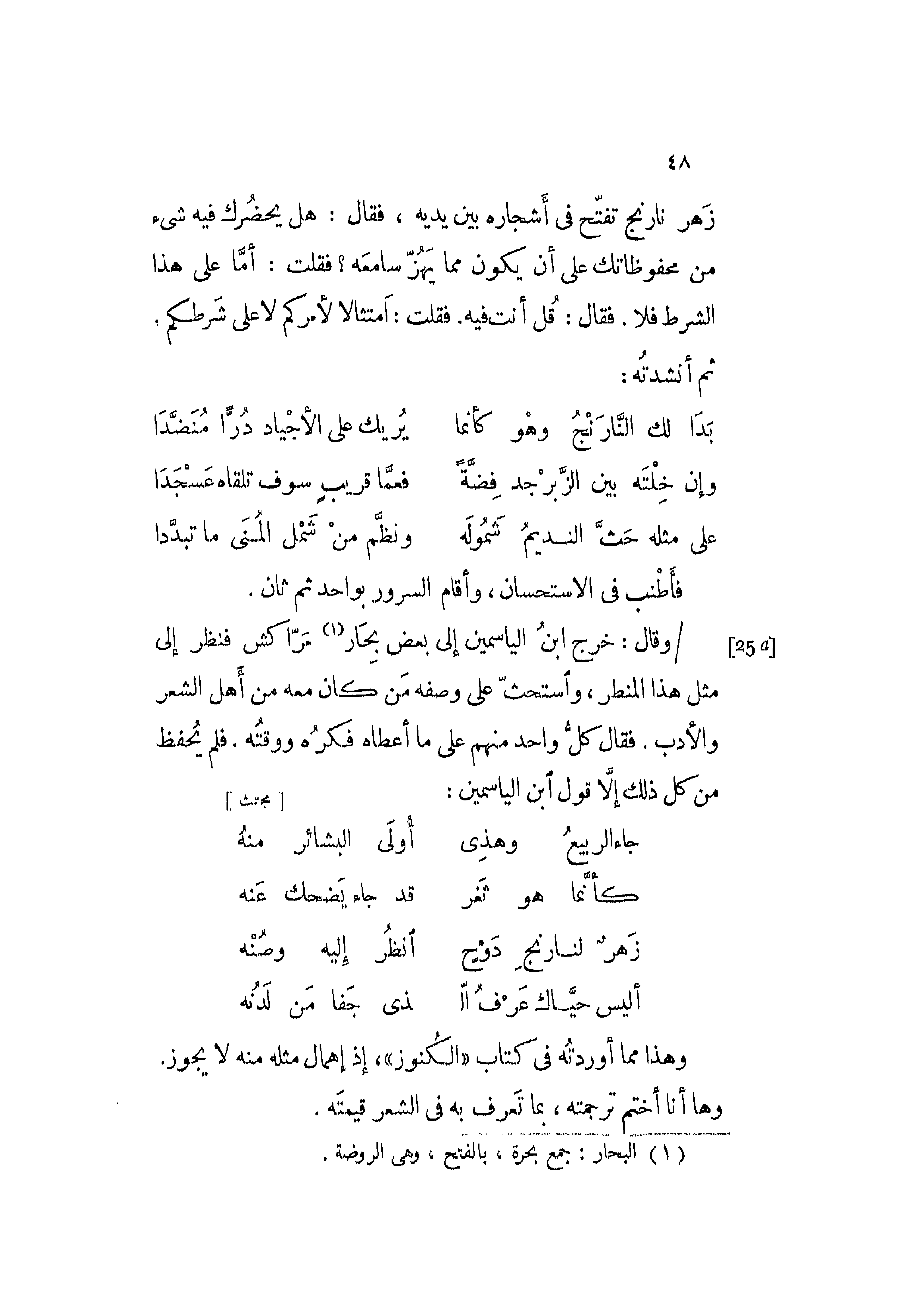 زهر نارنج تفتح في أشجاره بين يديه، فقال: هل يحضرك فيه شيء من محفوظاتك على أن يكون مما يهز سامعه؟ فقلت: أما على هذا الشرط فلا. فقال: قل أنت فيه. فقلت: امتثالا لأمركم لا على شطركم. ثم أنشدته: