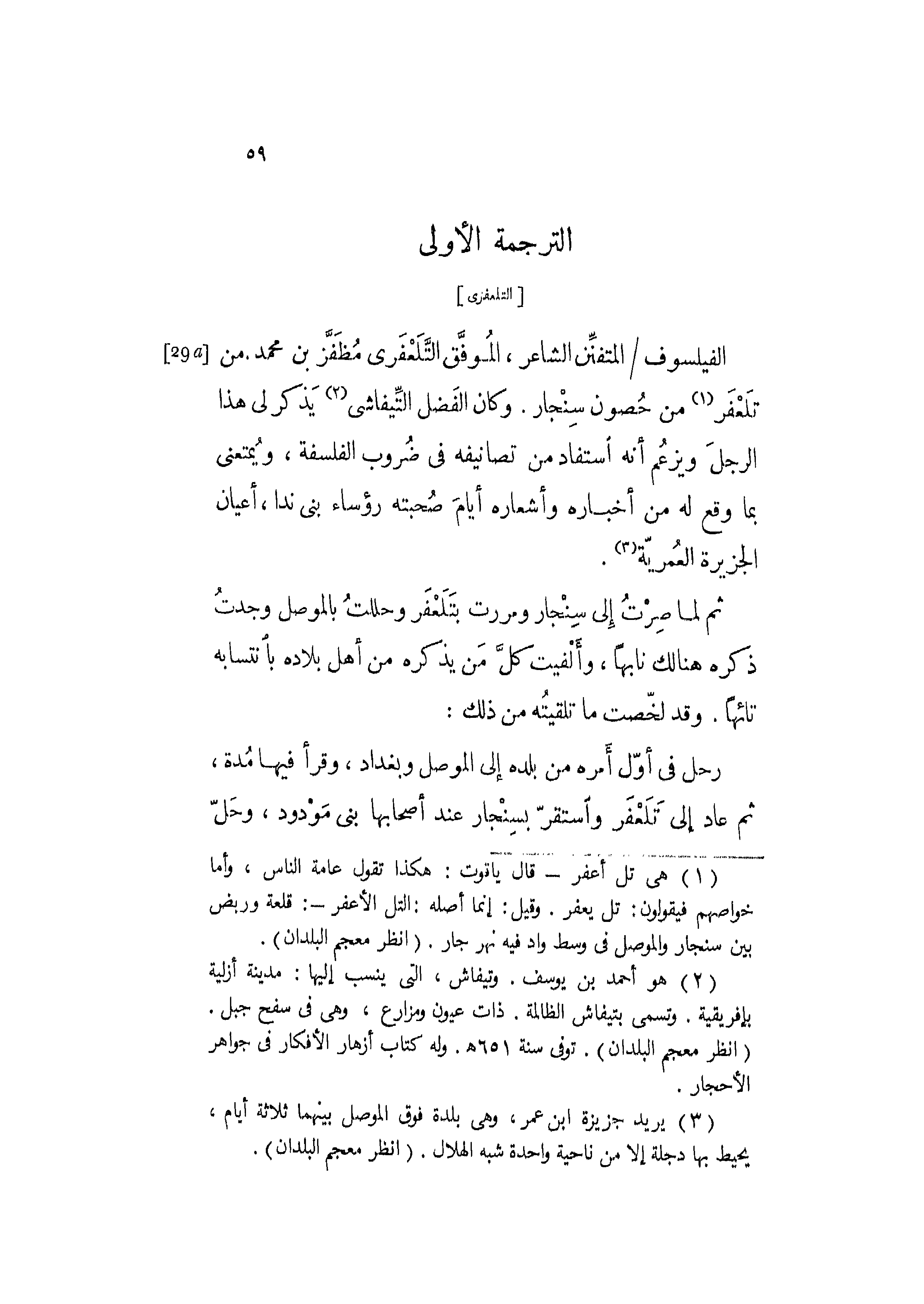 الفيلسوف المتفنن الشاعر، الموفق مظفر بن محمد. من تلعفر من حصون سنجار. وكان الفضل التيفاشي يذكر لي هذا الرجل ويزعم أنه استفاد من تصانيفه في ضروب الفلسفة، ويمتعني بما وقع له من أخباره وأشعاره أيام رؤساء بني ندا، أعيان الجزيرة العمرية.