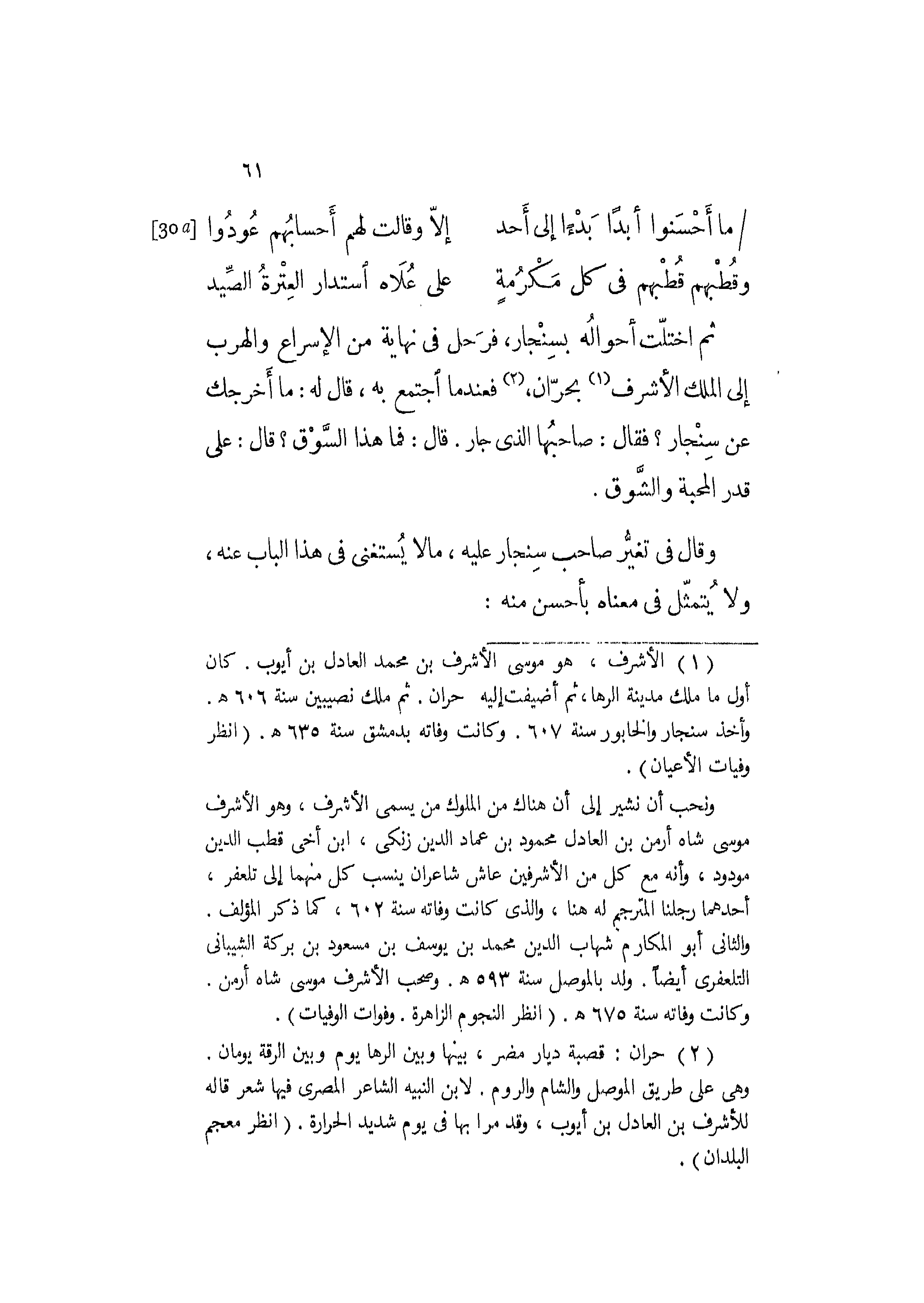ثم اختلت أحواله بسنجار، فرحل في نهاية من الإسراع والهرب إلى الملك الأشرف بحران، فعندما اجتمع به، قال له: ما أخرجك عن سنجار؟ فقال: صاحبها الذي جار. قال: فما هذا السوق؟ قال: على قدر المحبة والشوق.