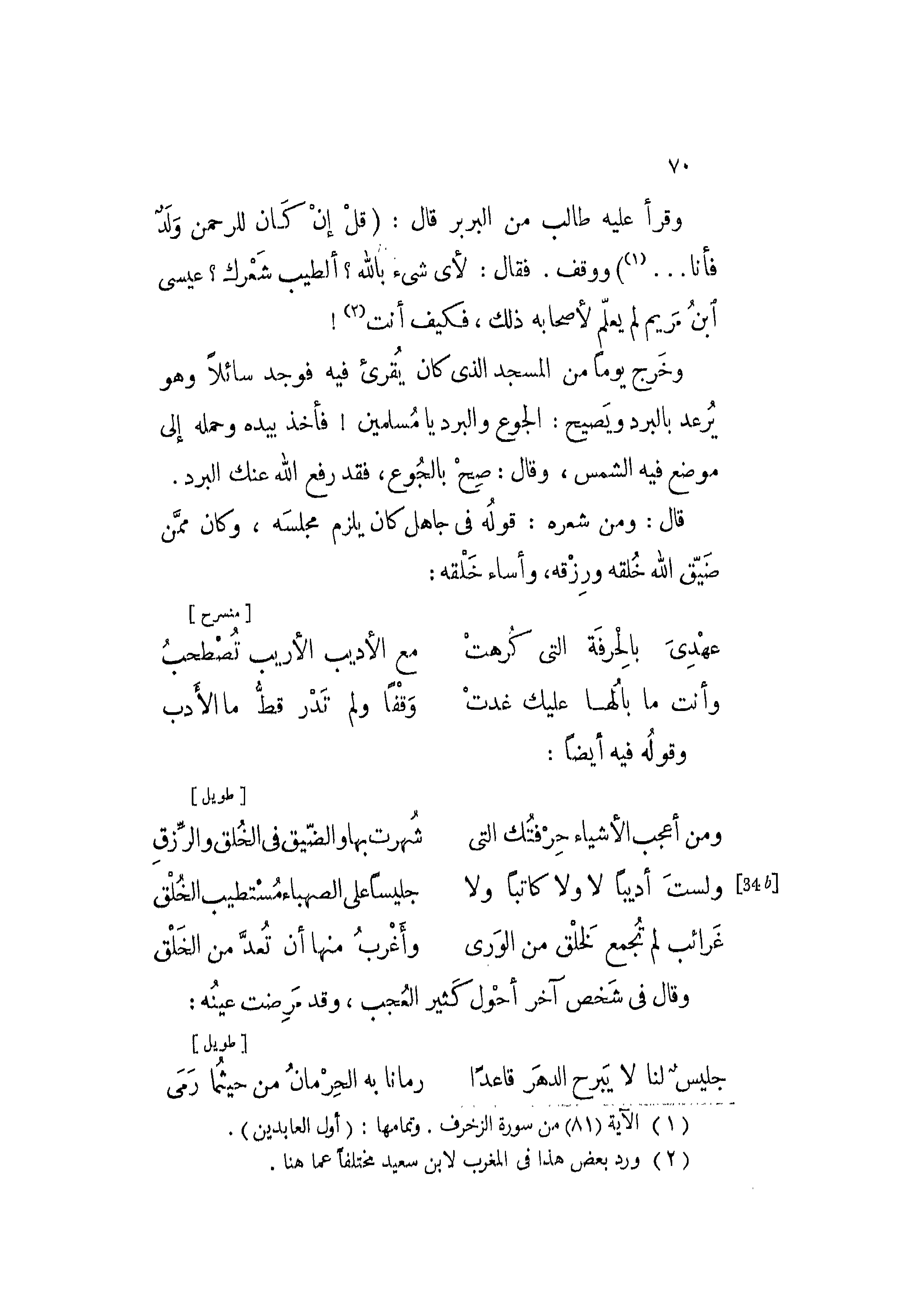 وقرأ عليه طالب من البربر قال: (قل إن كان للرحمن ولد فأنا ... ) ووقف. فقال: لأي شيء بالله؟ ألطيب شعرك؟ عيسى ابن مريم لم يعلم لأصحابه ذلك، فكيف أنت! وخرج يوماً من المسجد الذي كان يقرئ فيه فوجد سائلاً وهو يرعد بالبرد ويصيح: الجوع والبرد يا مسلمين! فأخذ بيده وحمله إلى موضع فيه الشمس. وقال: صح بالجوع، فقد رفع الله عنك البرد.