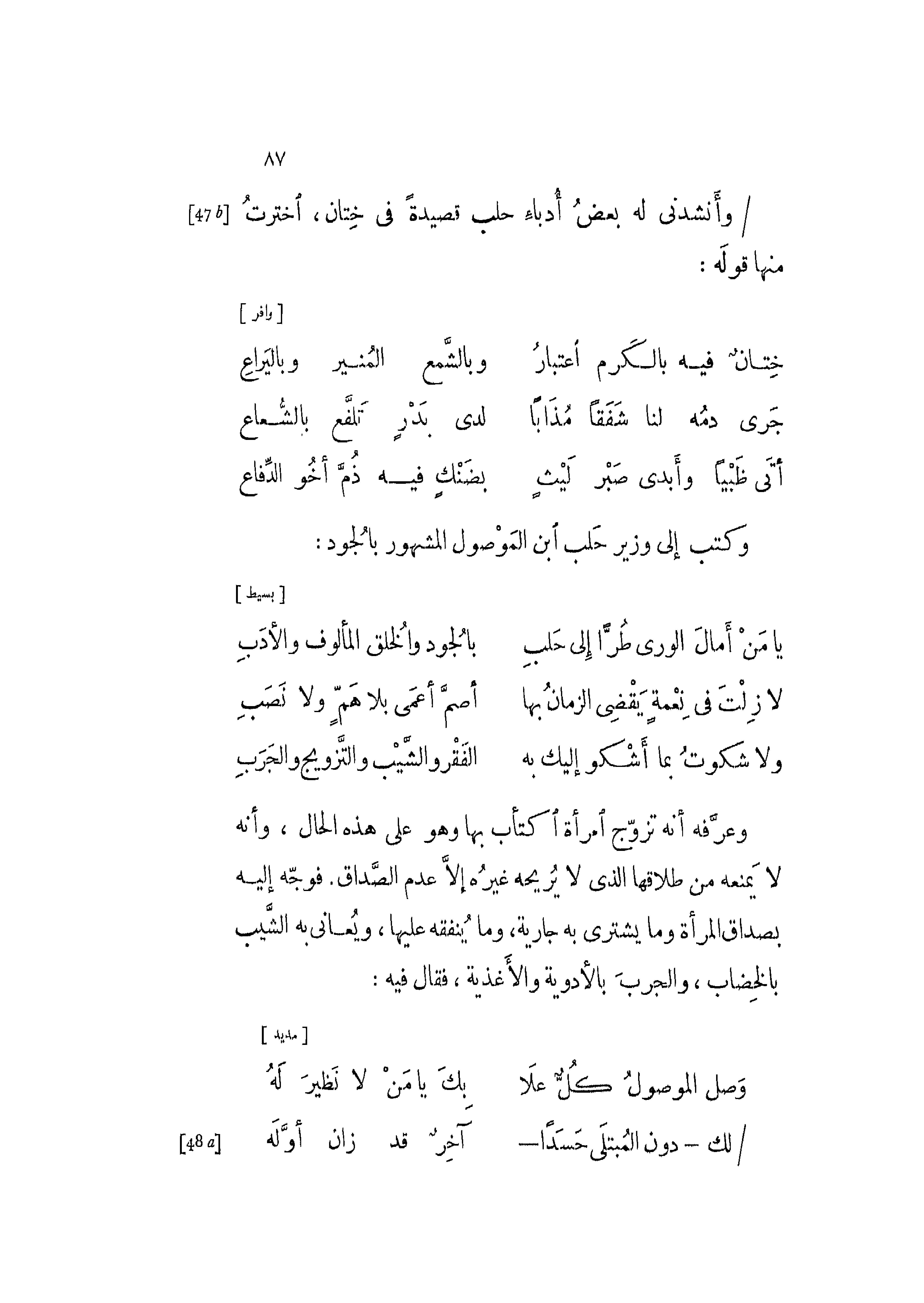 وعرفه أنه تزوج امرأة كتأب بها وهو على هذه الحال، وأنه لا يمنعه من طلاقها الذي لا يريحه غيره إلا عدم الصداق. فوجه إليه بصداق المرأة وما يشتري به جارية، وما ينفقه عليها، ويعاني به الشيب بالخضاب، والجرب بالأدوية والأغذية، فقال فيه: