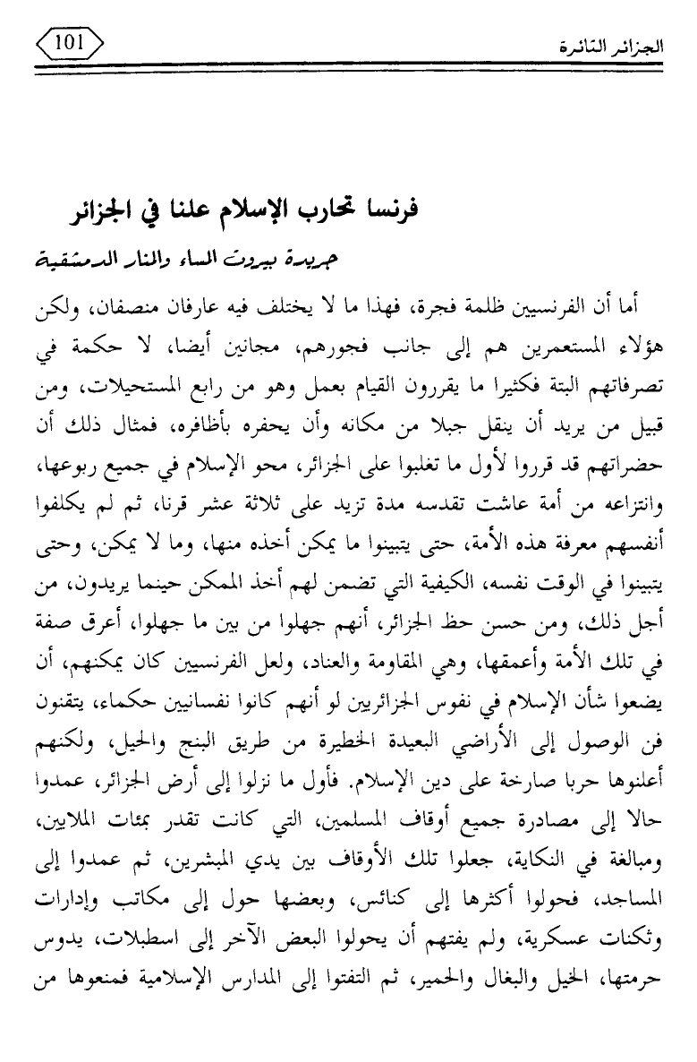 أما أن الفرنسيين ظلمة فجرة، فهذا ما لا يختلف فيه عارفان منصفان، ولكن هؤلاء المستعمرين هم إلى جانب فجورهم، مجانين أيضا، لا حكمة في تصرفاتهم البتة فكثيرا ما يقررون القيام بعمل وهو من رابع المستحيلات، ومن قبيل من يريد أن ينقل جبلا من مكانه وأن يحفره بأظافره، فمثال ذلك أن حضراتهم قد قرروا لأول ما تغلبوا على الجزائر، محو الإسلام في جميع ربوعها، وانتزاعه من أمة عاشت تقدسه مدة تزيد على ثلاثة عشر قرنا، ثم لم يكلفوا أنفسهم معرفة هذه الأمة، حتى يتبينوا ما يمكن أخذه منها، وما لا يمكن، وحتى يتبينوا في الوقت نفسه، الكيفية التي تضمن لهم أخذ الممكن حينما يريدون، من أجل ذلك، ومن حسن حظ الجزائر، أنهم جهلوا من بين ما جهلوا، أعرق صفة في تلك الأمة وأعمقها، وهي المقاومة والعناد، ولعل الفرنسيين كان يمكنهم، أن يضعوا شأن الإسلام في نفوس الجزائريين لو أنهم كانوا نفسانيين حكماء، يتقنون فن الوصول إلى الأراضي البعيدة الخطيرة من طريق البنج والحيل، ولكنهم أعلنوها حربا صارخة على دين الإسلام. فأول ما نزلوا إلى أرض الجزائر، عمدوا حالا إلى مصادرة جميع أوقاف المسلمين، التي كانت تقدر بمئات الملايين، ومبالغة في النكاية، جعلوا تك الأوقاف بين يدي المبشرين، ثم عمدوا إلى المساجد، فحولوا أكثرها إلى كنائس، وبعضها حول إلى مكاتب وإدارات وثكنات عسكرية، ولم يفتهم أن يحولوا البعض الآخر إلى اسطبلات، يدوس حرمتها، الخيل والبغال والحمير، ثم التفتوا إلى المدارس الإعلامية فمنعوها من