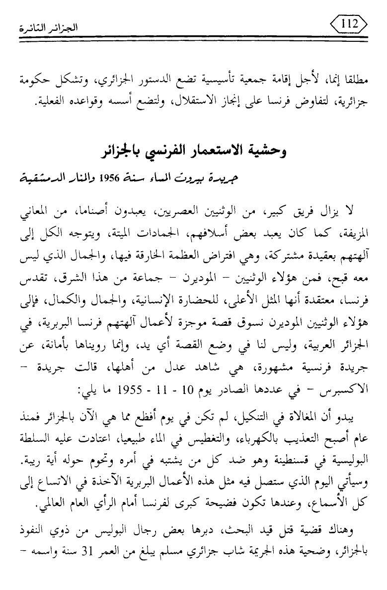 لا يزال فريق كبير، من الوثنيين العصريين، يعبدون أصناما، من المعاني المزيفة، كما كان يعبد بعض أسلافهم، الجمادات الميتة، ويتوجه الكل إلى آلهتهم بعقيدة مشتركة، وهي افتراض العظمة الخارقة فيها، والجمال الذي ليس معه قبح، فمن هؤلاء الوثنين - الموديرن - جماعة من هذا الشرق، تقدس فرنسا، معتقدة أنها المثل الأعلى، للحضارة الإنسانية، والجمال والكمال، فإلى هؤلاء الوثنيين الموديرن نسوق قصة موجزة لأعمال آلهتهم فرنسا البربرية، في الجزائر العربية، وليس لنا في وضع القصة أي يد، وإنما رويناها بأمانة، عن جريدة فرنسية مشهورة، هي شاهد عدل من أهلها، قالت جريدة - الاكسبرس - في عددها الصادر يوم 10 - 11 - 1955 ما يلي:
