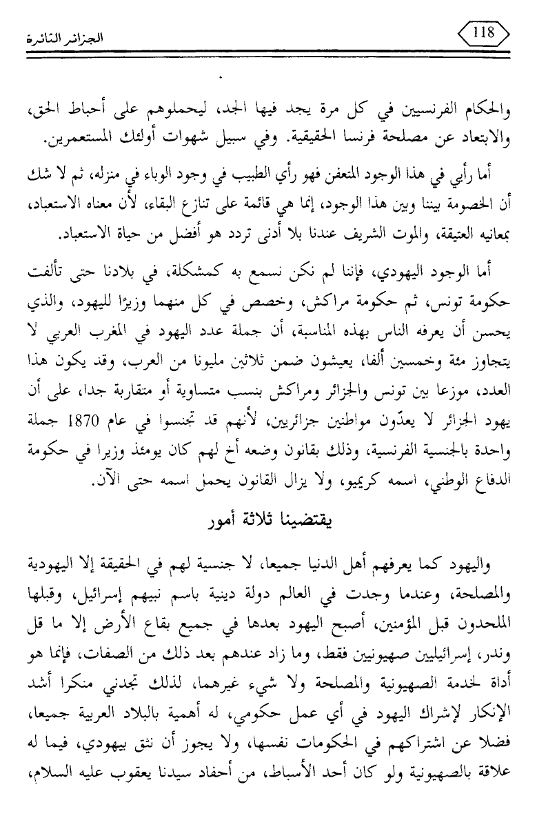أما الوجود اليهودي، فإننا لم نكن نسمع به كمشكلة، في بلادنا حتى تألفت حكومة تونس، ثم حكومة مراكش، وخصص في كل منهما وزيرا لليهود، والذي يحسن أن يعرفه الناس بهذه المناسبة، أن جملة عدد اليهود في المغرب العربي لا يتجاوز مئة وخمسين ألفا، يعيشون ضمن ثلاثين مليونا من العرب، وقد يكون هذا العدد، موزعا بين تونس والجزائر ومراكش بنسب متساوية أو متقاربة جدا، على أن يهود الجزائر لا يعدون مواطنين جزائريين، لأنهم قد تجنسوا في عام 870اجملة واحدة بالجنسية الفرنسية، وذلك بقانون وضعه أخ لهم كان يومئذ وزيرا في حكومة الدفاع الوطني، اسمه كريميو، ولا يزال القانون يحمل اسمه حتى الآن.