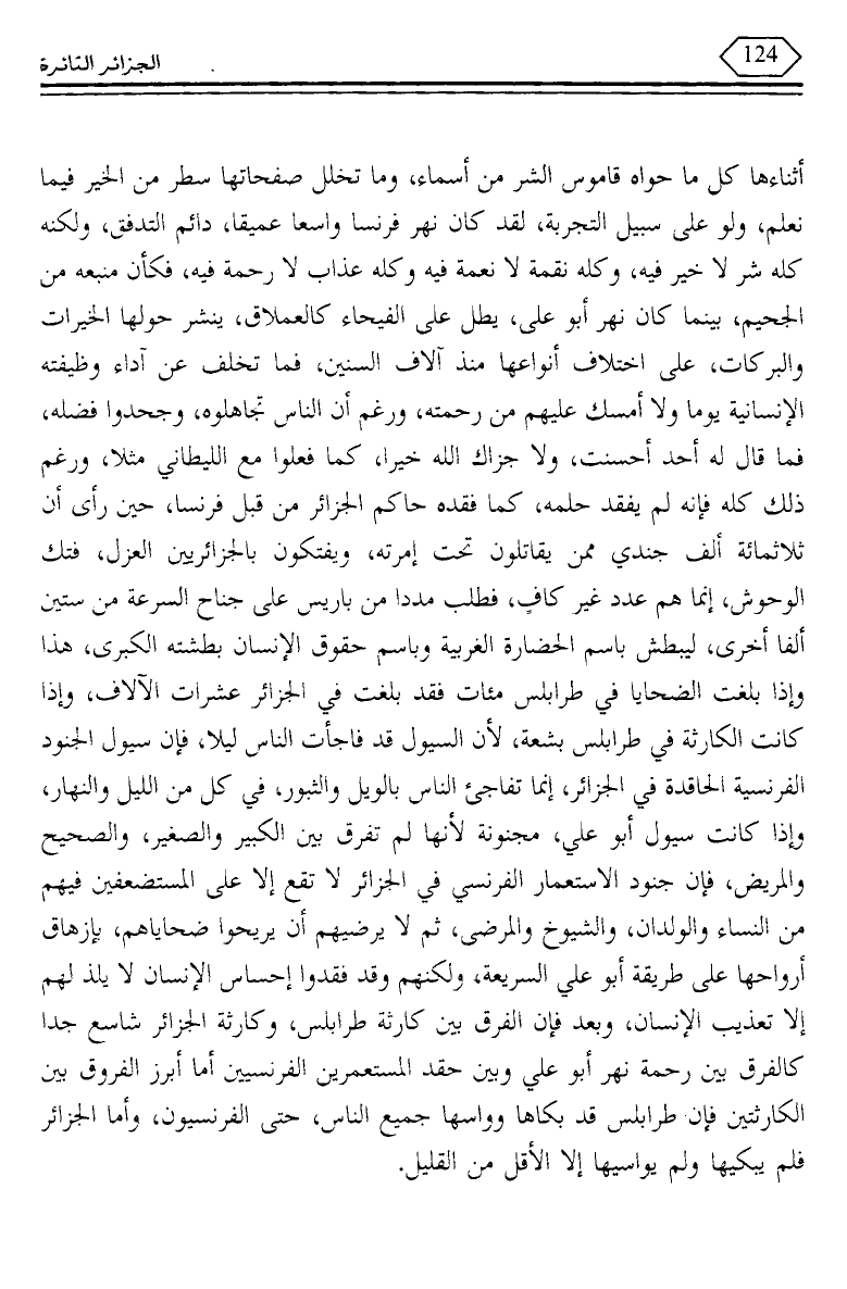 أثناءها كل ما حواه قاموس الشر من أسماء، وما تخلل صفحاتها سطر من الخير فيما نعلم، ولو على سبيل التجربة، لقد كان نهر فرنسا واسعا عميقا، دائم التدفق، ولكنه كله شر لا خير فيه، وكله نقمة لا نعمة فيه وكله عذاب لا رحمة فيه، فكأن منبعه من الجحيم، بينما كان نهر أبو علي، يطل على الفيحاء كالعملاق، ينشر حولها الخيرات والبركات، على اختلاف أنواعها منذ آلاف السنين، فما تخلف عن آداء وظيفته الإنسانية يوما ولا أمسك عليهم من رحمته، ورغم أن الناس تجاهلوه، وجحدوا فضله، فما قال له أحد أحسنت، ولا جزاك الله خيرا، كما فعلوا مع الليطاني مثلا، ورغم ذلك كله فإنه لم يفقد حلمه، كما فقده حاكم الجزائر من قبل فرنسا، حين رأى أن ثلاثمائة ألف جندي ممن يقاتلون تحت إمرته، ويفتكون بالجزائريين العزل، فتك الوحوش، إنما هم عدد غير كاف، فطلب مددا من باريس على جناح السرعة من ستين ألفا أخرى، ليبطش باسم الحضارة الغربية وباسم حقوق الإنسان بطشته الكبرى، هذا وإذا بلغت الضحايا في طرابلس مئات فقد بلغت في الجزائر عشرات الآلاف، وإذا كانت الكارثة في طرابلس بشعة، لأن السيول قد فاجأت الناس ليلا، فإن سيول الجنود الفرنسية الحاقدة في الجزائر، إنما تفاجئ الناس بالويل والثبور، في كل من الليل والنهار، وإذا كانت سيول أبو علي، مجنونة لأنها لم تفرق بين الكبير والصغير، والصحيح والمريض، فإن جنود الاستعمار الفرنسي في الجزائر لا تقع إلا على المستضعفين فيهم من النساء والولدان، والشيوخ والمرضى، ثم لا يرضيهم أن يريحوا ضحاياهم، بإزهاق أرواحها على طريقة أبو علي السريعة، ولكنهم وقد فقدوا إحساس الإنسان لا يلذ لهم إلا تعذيب الإنسان، وبعد فإن الفرق بين كارثة طرابلس، وكارثة الجزائر شاسع جدا كالفرق بين رحمة نهر أبو علي وبين حقد المستعمرين الفرنسيين أما أبرز الفروق بين الكارثتين فإن طرابلس قد بكاها وواسها جميع الناس، حتى الفرنسيون، وأما الجزائر فلم يبكيها ولم يواسيها إلا الأقل من القليل.