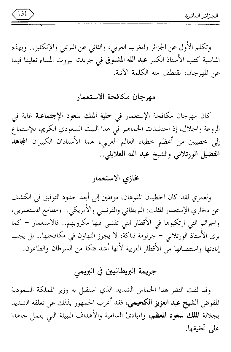 كان مهرجان مكافحة الاستعمار في خلية الملك سعود الاجتماعية غاية في الروعة والجلال، إذ احتشدت الجماهير في هذا البيت، السعودي الكريم، للاستماع إلى خطيبين من أعظم خطباء العالم العربي، هما الأستاذان الكبيران المجاهد