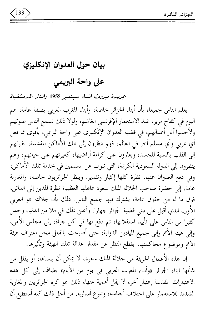 يعلم الناس جميعا، بأن أبناء الجزائر خاصة، وأبناء المغرب العربي بصفة عامة، هم اليوم في كفاح مرير، ضد الاستعمار الإفرنسي الغاشم، ولولا ذلك لسمع الناس صوتهم ولأحسوا آثار أعمالهم، في قضية العدوان الإنكليزي على واحة البريمي، بأقوى مما فعل أي عربي وأي مسلم آخر في العالم، فهم ينظرون إلى تلك الأماكن المقدسة، نظرتهم إلى القلب بالنسبة للجسد، ويغارون على كرامة أراضيها، كغيرتهم على حياتهم، وهم ينظرون إلى الدولة السعودية الكريمة، التي تنوب عن المسلمين في خدمه تلك الأماكن، وفي دفع العدوان عنها، نظرة كلها إكبار وتقدير. وينظر الجزائريون خاصة، والمغاربة عامة، إلى حضرة صاحب الجلالة الملك سعود عاهلها العظيم؛ نظرة المدين إلى الدائن، فوق ما له من حقوق عامة، يشترك فيها جميع الناس. ذلك بأن جلالته هو العربي الأول، الذي أقبل على تبني قضية الجزائر جهارا، وأعلن ذلك في ملأ من الدنيا، وحمل كثيرا من الناس على تأييد استقلالها، ثم دفع بها في كل جرأة، إلى مجلس الأمن، وإلى هيئة الأمم وإلى جميع الميادين الدولية، حتى أصبحت بالفعل محل اعتراف هيئة الأمم وموضوع محاكمتها، بقطع النظر عن مقدار عدالة تلك الهيئة وتأثيرها.