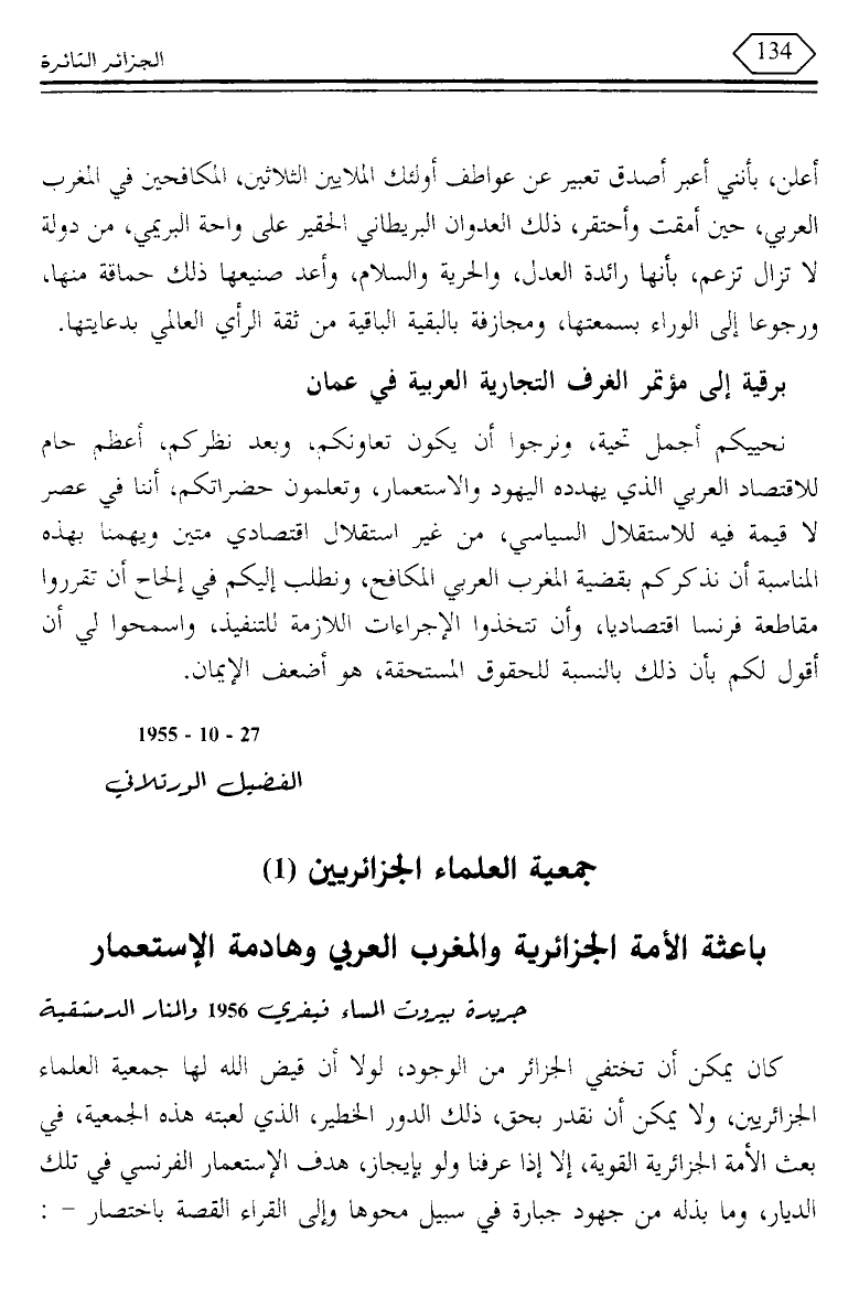 نحييكم أجمل تحية، ونرجوا أن يكون تعاونكم، وبعد نظركم، أعظم حام للاقتصاد العربي الذي يهدده اليهود والاستعمار، وتعلمون حضراتكم، أننا في عصر لا قيمة فيه للاستقلال السياسي، من غير استقلال اقتصادي متين ويهمنا بهذه المناسبة أن نذكركم بقضية المغرب العربي المكافح، ونطلب إليكم في إلحاح أن تقرروا مقاطعة فرنسا اقتصاديا، وأن تتخذوا الإجراءات اللازمة للتنفيذ، واسمحوا لي أن أقول لكم بأن ذلك بالنسبة للحقوق المستحقة، هو أضعف الإيمان.