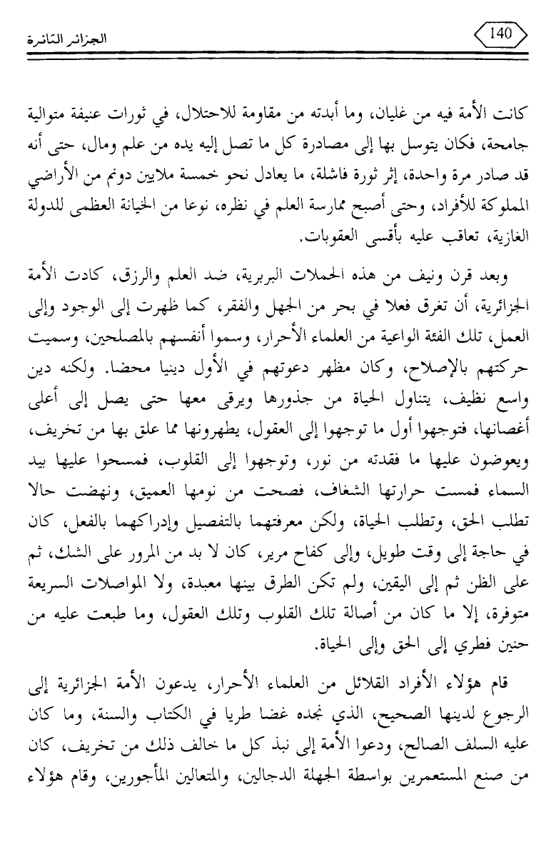 وبعد قرن ونيف من هذه الحملات البربرية، ضد العلم والرزق، كادت الأمة الجزائرية، أن تغرق فعلا في بحر من الجهل والفقر، كما ظهرت إلى الوجود وإلى العمل، تلك الفئة الواعية من العلماء الأحرار، وسموا أنفسهم بالمصلحين، وسميت حركتهم بالإصلاح، وكان مظهر دعوتهم في الأول دينيا محضا. ولكنه دين واسع نظيف، يتناول الحياة من جذورها ويرقى معها حتى يصل إلى أعلى أغصانها، فتوجهوا أول ما توجهوا إلى العقول، يطهرونها مما علق بها من تخريف، ويعوضون عليها ما فقدته من نور، وتوجهوا إلى القلوب، فمسحوا عليها بيد السماء فمست حرارتها الشغاف، فصحت من نومها العميق، ونهضت حالا تطلب الحق، وتطلب الحياة، ولكن معرفتهما بالتفصيل وإدراكهما بالفعل، كان في حاجة إلى وقت طويل، وإلى كفاح مرير، كان لا بد من المرور على الشك، ثم على الظن نم إلى اليقين، ولم تكن الطرق بينها معبدة، ولا المواصلات السريعة متوفرة، إلا ما كان من أصالة تلك القلوب وتلك العقول، وما طبعت عليه من حنين فطري إلى الحق وإلى الحياة.