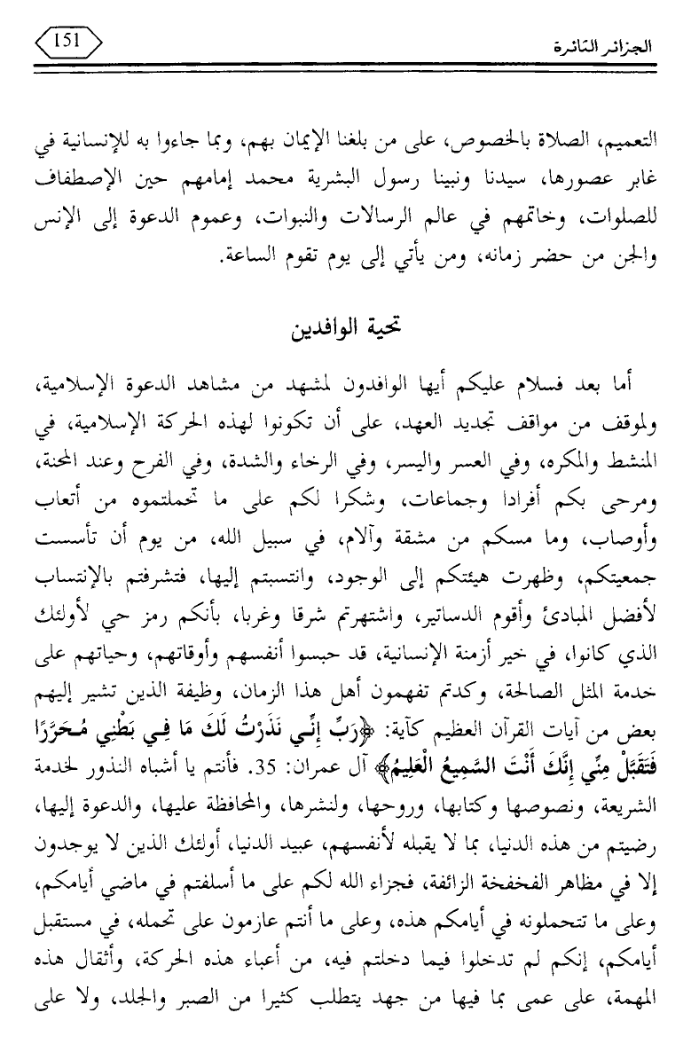أما بعد فسلام عليكم أيها الوافدون لمشهد من مشاهد الدعوة الإسلامية، ولموقف من مواقف تجديد العهد، على أن تكونوا لهذه الحركة الإسلامية، في المنشط والمكره، وفي العسر واليسر، وفي الرخاء والشدة، وفي الفرح وعند المحنة، ومرحى بكم أفرادا وجماعات، وشكرا لكم على ما تحملتموه من أتعاب وأوصاب، وما مسكم من مشقة وآلام، في سبيل الله، من يوم أن تأسست جمعيتكم، وظهرت هيئتكم إلى الوجود، وانتسبتم إليها، فتشرفتم بالإنتساب لأفضل المبادئ وأقوم الدساتير، واشتهرتم شرقا وغربا، بأنكم رمز حي لأولئك الذي كانوا، في خير أزمنة الإنسانية، قد حبسوا أنفسهم وأوقاتهم، وحياتهم على خدمة المثل الصالحة، وكدتم تفهمون أهل هذا الزمان، وظيفة الذين تشير إليهم بعض من آيات القرآن العظيم كآية: {رب إني نذرت لك ما في بطني محررا فتقبل مني إنك أنت السميع العليم} آل عمران: 35. فأنتم يا أشباه النذور لخدمة الشريعة، ونصوصها وكتابها، وروحها، ولنشرها، والمحافظة عليها، والدعوة إليها، رضيتم من هذه الدنيا، بما لا يقبله لأنفسهم، عبيد الدنيا، أولئك الذين لا يوجدون إلا في مظاهر الفخفخة الزائفة، فجزاء الله لكم على ما أسلفتم في ماضي أيامكم، وعلى ما تتحملونه في أيامكم هذه، وعلى ما أنتم عازمون على تحمله، في مستقبل أيامكم، إنكم لم تدخلوا فيما دخلتم فيه، من أعباء هذه الحركة، وأثقال هذه المهمة، على عمى بما فيها من جهد يتطلب كثيرا من الصبر والجلد، ولا على