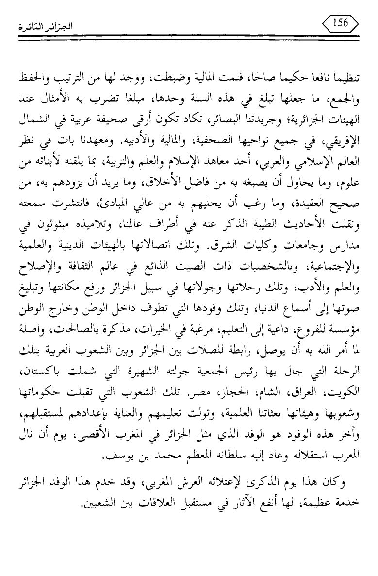 تنظيما نافعا حكيما صالحا، فنمت المالية وضبطت، ووجد لها من الترتيب والحفظ والجمع، ما جعلها تبلغ في هذه السنة وحدها، مبلغا تضرب به الأمثال عند الهيئات الجزائرية؛ وجريدتنا البصائر، تكاد تكون أرقى صحيفة عربية في الشمال الإفريقي، في جميع نواحيها الصحفية، والمالية والأدبية. ومعهدنا بات في نظر العالم الإسلامي والعربي، أحد معاهد الإسلام والعلم والتربية، بما يلقنه لأبنائه من علوم، وما يحاول أن يصبغه به من فاضل الأخلاق، وما يريد أن يزودهم به، من صحيح العقيدة، وما رغب أن يحليهم به من عالي المبادئ، فانتشرت سمعته ونقلت الأحاديث الطيبة الذكر عنه في أطراف عالمنا، وتلاميذه مبثوثون في مدارس وجامعات وكليات الشرق. وتلك اتصالاتها بالهيئات الدينية والعلمية والإجتماعية، وبالشخصيات ذات الصيت الذائع في عالم الثقافة والإصلاح والعلم والأدب، وتلك رحلاتها وجولاتها في سبيل الجزائر ورفع مكانتها وتبليغ صوتها إلى أسماع الدنيا، وتلك وفودها التي تطوف داخل الوطن وخارج الوطن مؤسسة للفروع، داعية إلى التعليم، مرغبة في الخيرات، مذكرة بالصالحات، واصلة لما أمر الله به أن يوصل، رابطة للصلات بين الجزائر وبين الشعوب العربية بتلك الرحلة التي جال بها رئيس الجمعية جولته الشهيرة التي شملت باكستان، الكويت، العراق، الشام، الحجاز، مصر. تلك الشعوب التي تقبلت حكوماتها وشعوبها وهيئاتها بعثاتنا العلمية، وتولت تعليمهم والعناية بإعدادهم لمستقبلهم، وآخر هذه الوفود هو الوفد الذي مثل الجزائر في المغرب الأقصى، يوم أن نال المغرب استقلاله وعاد إليه سلطانه المعظم محمد بن يوسف.