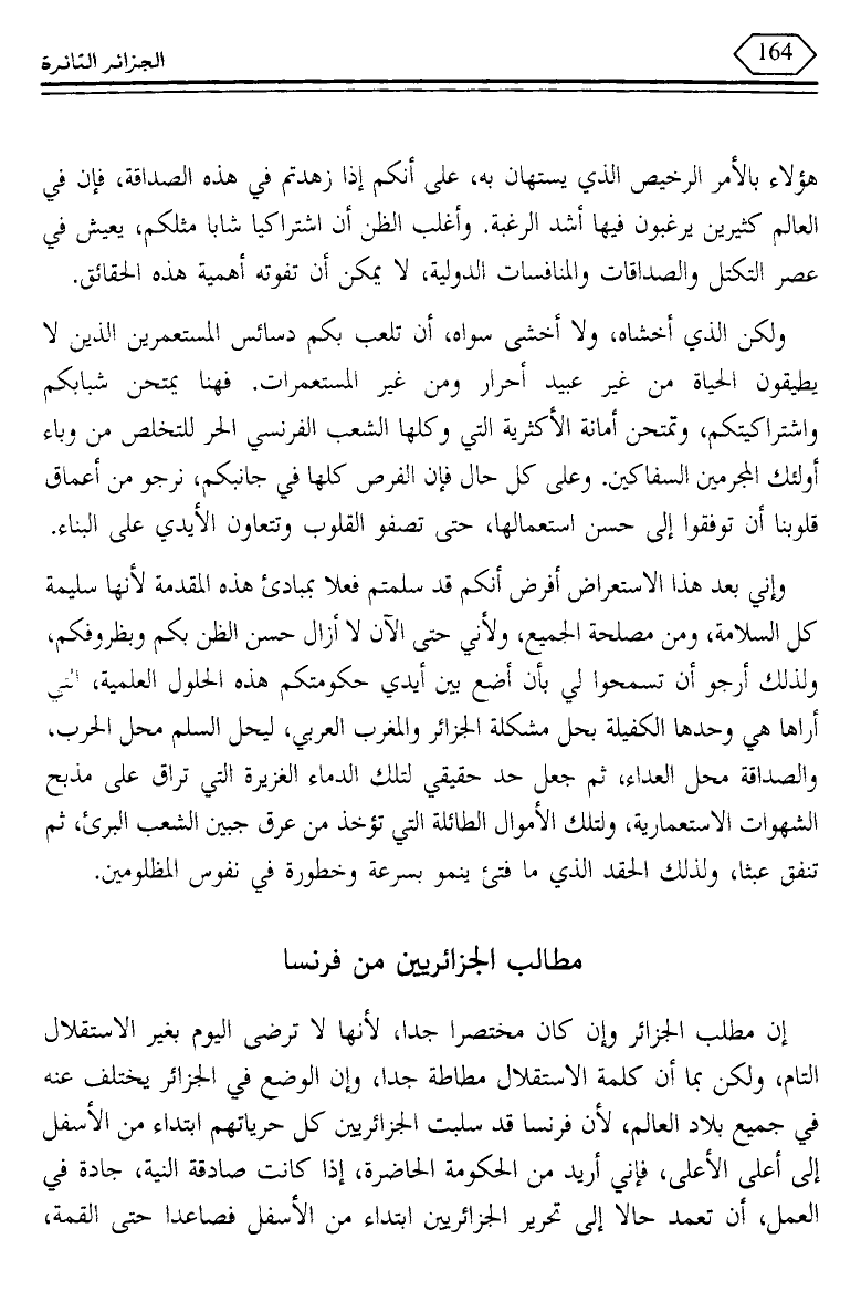 إن مطلب الجزائر وإن كان مختصرا جدا، لأنها لا ترضى اليوم بغير الاستقلال التام، ولكن بما أن كلمة الاستقلال مطاطة جدا، وإن الوضع في الجزائر يختلف عنه في جميع بلاد العالم، لأن فرنسا قد سلبت الجزائريين كل حرياتهم ابتداء من الأسفل إلى أعلى الأعلى، فإني أريد من الحكومة الحاضرة، إذا كانت صادقة النية، جادة في العمل، أن تعمد حالا إلى تحرير الجزائريين ابتداء من الأسفل فصاعدا حتى القمة،