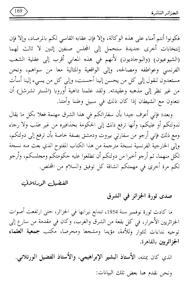 الذي كان يمثله، الأستاذ البشير الإبراهيمي، والأستاذ الفضيل الورتلاني.