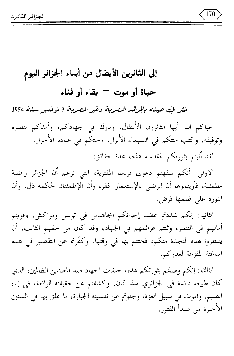 الثالثة: إنكم وصلتم بثورتكم هذه، حلقات الجهاد ضد المعتدين الظالمين، الذي كان طبيعة دائمة في الجزائري منذ كان، وكشفتم عن حقيقته الرائعة، في إباء الضيم، والموت في سبيل العزة، وجلوتم عن نفسيته الجبارة، ما علق بها في السنين الأخيرة من صدأ الفتور.