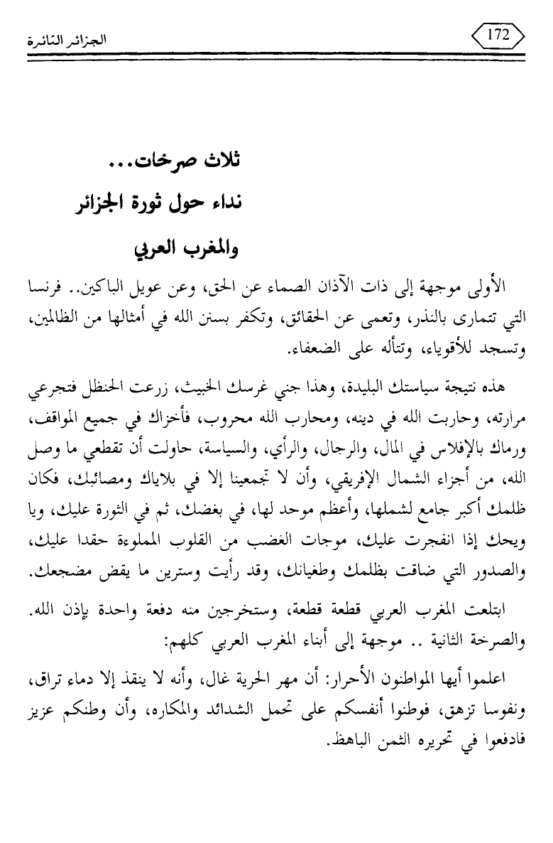 ابتلعت المغرب العربي قطعة قطعة، وستخرجين منه دفعة واحدة بإذن الله. والصرخة الثانية .. موجهة إلى أبناء المغرب العربي كلهم: