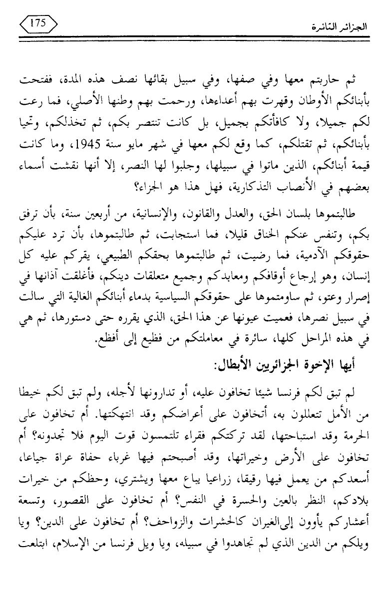 ثم حاربتم معها وفي صفها، وفي سبيل بقائها نصف هذه المدة، ففتحت بأبنائكم الأوطان وقهرت بهم أعداءها، ورحمت بهم وطنها الأصلي، فما رعت لكم جميلا، ولا كافأتكم بجميل، بل كانت تنتصر بكم، ثم تخذلكم، وتحيا بأبنائكم، ثم تقتلكم، كما وقع لكم معها في شهر مايو سنة 1945، وما كانت قيمة أبنائكم، الذين ماتوا في سبيلها، وجلبوا لها النصر، إلا أنها نقشت أسماء بعضهم في الأنصاب التذكارية، فهل هذا هو الجزاء؟