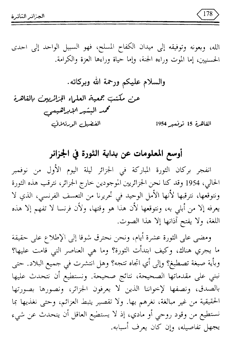 ومضى على الثورة عشرة أيام، ونحن نحترق شوقا إلى الإطلاع على حقيقة ما يجري هناك، وكيف ابتدأت الثورة؟ وما هي العناصر التي قامت عليها؟ وبأية صبغة تصطبغ؟ وإلى أي اتجاه تتجه؟ وهل انتشرت في جميع البلاد، حتى نبني على مقدماتها الصحيحة، نتائج صحيحة. ونستطيع أن نتحدث عليها بالصدق، ونصفها لإخواننا الذين لا يعرفون الجزائر، ونصورها بصورتها الحقيقية من غير مبالغة، نغرهم بها. ولا تقصير يثبط العزائم، وحتى نغذيها بما نستطيع من وقود روحي أو مادي، إذ لا يستطيع العاقل أن يتحدث عن شيء يجهل تفاصيله، وإن كان يعرف أسبابه.