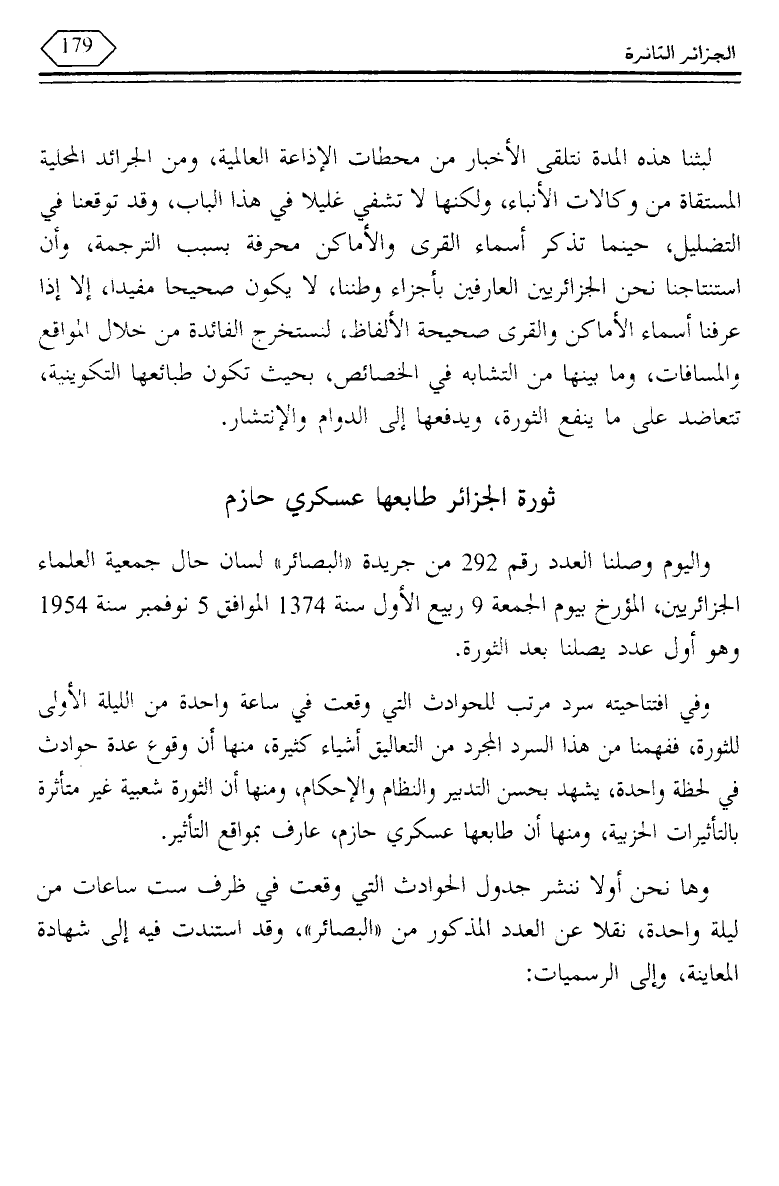لبثنا هذه المدة نتلقى الأخبار من محطات الإذاعة العالمية، ومن الجرائد المحلية المستقاة من وكالات الأنباء، ولكنها لا تشفي غليلا في هذا الباب، وقد توقعنا في التضليل، حينما تذكر أسماء القرى والأماكن محرفة بسبب الترجمة، وأن استنتاجنا نحن الجزائريين العارفين بأجزاء وطننا، لا يكون صحيحا مفيدا، إلا إذا عرفنا أسماء الأماكن والقرى صحيحة الألفاظ، لنستخرج الفائدة من خلال المواقع والمسافات، وما بينها من التشابه في الخصائص، بحيث تكون طبائعها التكوينية، تتعاضد على ما ينفع الثورة، ويدفعها إلى الدوام والانتشار.