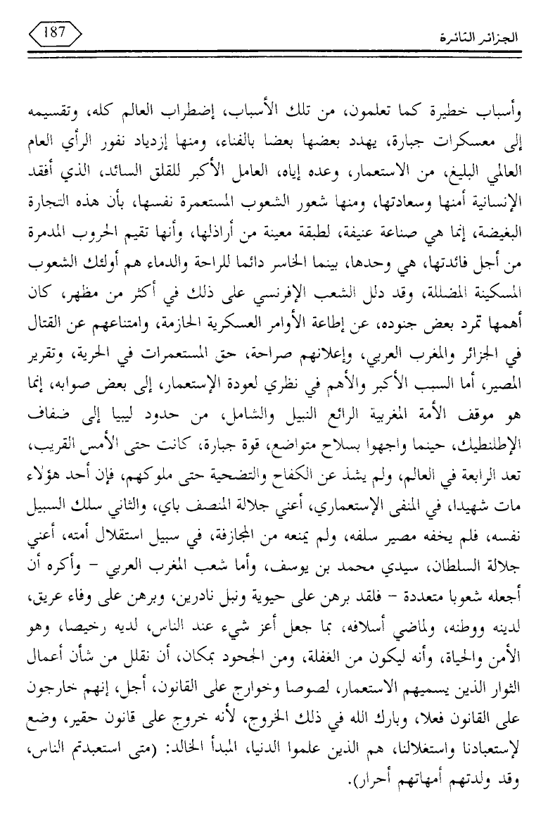 وأسباب خطيرة كما تعلمون، من تلك الأسباب، اضطراب العالم كله، وتقسيمه إلى معسكرات جبارة، يهدد بعضها بعضا بالفناء، ومنها ازدياد نفور الرأي العام العالمي البليغ، من الاستعمار، وعده إياه، العامل الأكبر للقلق السائد، الذي أفقد الإنسانية أمنها وسعادتها، ومنها شعور الشعوب المستعمرة نفسها، بأن هذه التجارة البغيضة، إنما هي صناعة عنيفة، لطبقة معينة من أراذلها، وأنها تقيم الحروب المدمرة من أجل فائدتها، هي وحدها، بينما الخاسر دائما للراحة والدماء هم أولئك الشعوب المسكينة المضللة، وقد دلل الشعب الإفرنسي على ذلك في أكثر من مظهر، كان أهمها تمرد بعض جنوده، عن إطاعة الأوامر العسكرية الحازمة، وامتناعهم عن القتال في الجزائر والمغرب العربي، وإعلانهم صراحة، حق المستعمرات في الحرية، وتقرير المصير، أما السبب الأكبر والأهم في نظري لعودة الاستعمار، إلى بعض صوابه، إنما هو موقف الأمة المغربية الرائع النبيل والشامل، من حدود ليبيا إلى ضفاف الإطلنطيك، حينما واجهوا بسلاح متواضع، قوة جبارة، كانت حتى الأمس القريب، تعد الرابعة في العالم، ولم يشذ عن الكفاح والتضحية حتى ملوكهم، فإن أحد هؤلاء مات شهيدا، في المنفى الاستعماري، أعني جلالة المنصف باي، والثاني سلك السبيل نفسه، فلم يخفه مصير سلفه، ولم يمنعه من المجازفة، في سبيل استقلال أمته، أعني جلالة السلطان، سيدي محمد بن يوسف، وأما شعب المغرب العربي - وأكره أن أجعله شعوبا متعددة - فلقد برهن على حيوية ونبل نادرين، وبرهن على وفاء عريق، لدينه ووطنه، ولماضي أسلافه، بما جعل أعز شيء عند الناس، لديه رخيصا، وهو الأمن والحياة، وأنه ليكون من الغفلة، ومن الجحود بمكان، أن نقلل من شأن أعمال الثوار الذين يسميهم الاستعمار، لصوصا وخوارج على القانون، أجل، إنهم خارجون على القانون فعلا، وبارك الله في ذلك الخروج، لأنه خروج على قانون حقير، وضع لاستعبادنا واستغلالنا، هم الذين علموا الدنيا، المبدأ الخالد: (متى استعبدتم الناس، وقد ولدتهم أمهاتهم أحرار).