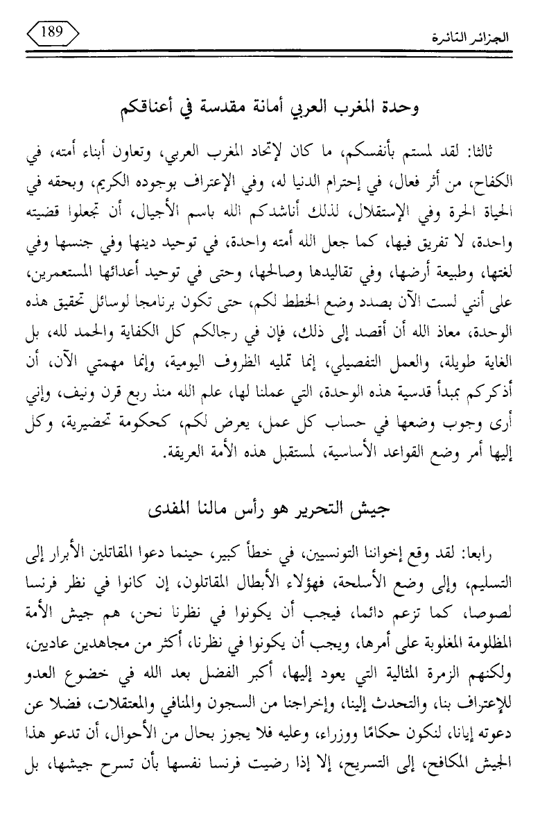 ثالثا: لقد لمستم بأنفسكم، ما كان لاتحاد المغرب العربي، وتعاون أبناء أمته، في الكفاح، من أثر فعال، في احترام الدنيا له، وفي الاعتراف بوجوده الكريم، وبحقه في الحياة الحرة وفي الاستقلال، لذلك أناشدكم الله باسم الأجيال، أن تجعلوا قضيته واحدة، لا تفريق فيها، كما جعل الله أمته واحدة، في توحيد دينها وفي جنسها وفي لغتها، وطبيعة أرضها، وفي تقاليدها وصالحها، وحتى في توحيد أعدائها المستعمرين، على أنني لست الآن بصدد وضع الخطط لكم، حتى تكون برنامجا لوسائل تحقيق هذه الوحدة، معاذ الله أن أقصد إلى ذلك، فإن في رجالكم كل الكفاية والحمد لله، بل الغاية طويلة، والعمل التفصيلي، إنما تمليه الظروف اليومية، وإنما مهمتي الآن، أن أذكركم بمبدأ قدسية هذه الوحدة، التي عملنا لها، علم الله منذ ربع قرن ونيف، وإني أرى وجوب وضعها في حساب كل عمل، يعرض لكم، كحكومة تحضيرية، وكل إليها أمر وضع القواعد الأساسية، لمستقبل هذه الأمة العريقة.