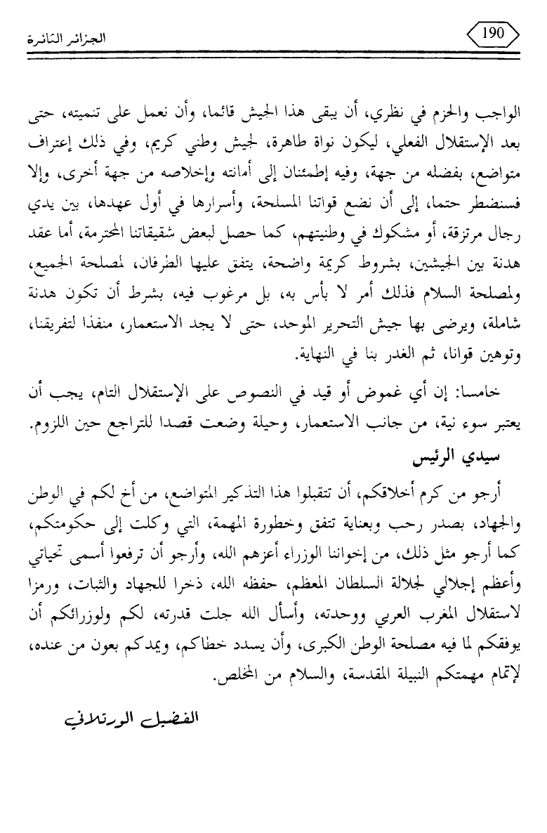 أرجو من كرم أخلاقكم، أن تتقبلوا هذا التذكير المتواضع، من أخ لكم في الوطن والجهاد، بصدر رحب وبعناية تتفق وخطورة المهمة، التي وكلت إلى حكومتكم، كما أرجو مثل ذلك، من إخواننا الوزراء أعزهم الله، وأرجو أن ترفعوا أسمى تحياتي وأعظم إجلالي لجلاله السلطان المعظم، حفظه الله، ذخرا للجهاد والثبات، ورمزا لاستقلال المغرب العربي ووحدته، وأسأل الله جلت قدرته، لكم ولوزرائكم أن يوفقكم لما فيه مصلحة الوطن الكبرى، وأن يسدد خطاكم، ويمدكم بعون من عنده، لإتمام مهمتكم النبيلة المقدسة، والسلام من المخلص.