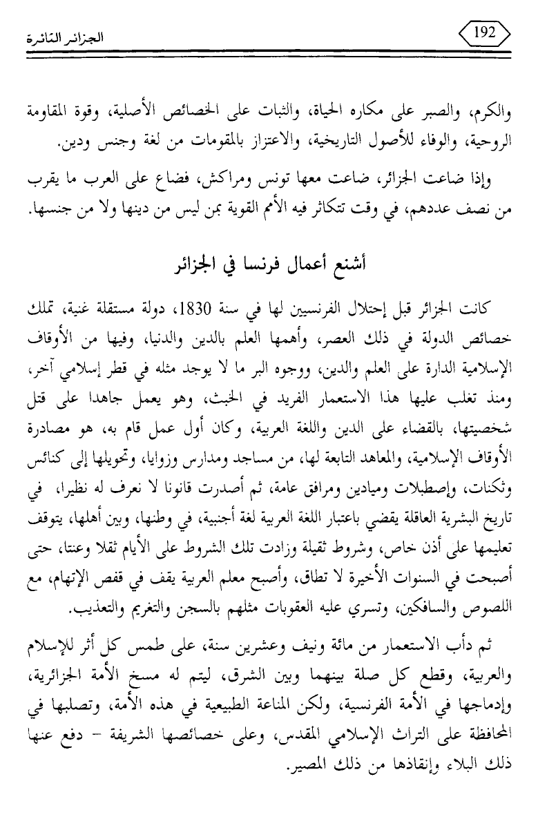 ثم دأب الاستعمار من مائة ونيف وعشرين سنة، على طمس كل أثر للإسلام والعربية، وقطع كل صلة بينهما وبين الشرق، ليتم له مسخ الأمة الجزائرية، وإدماجها في الأمة الفرنسية، ولكن المناعة الطبيعية في هذه الأمة، وتصلبها في المحافظة على التراث الإسلامي المقدس، وعلى خصائصها الشريفة - دفع عنها ذلك البلاء وإنقاذها من ذلك المصير.