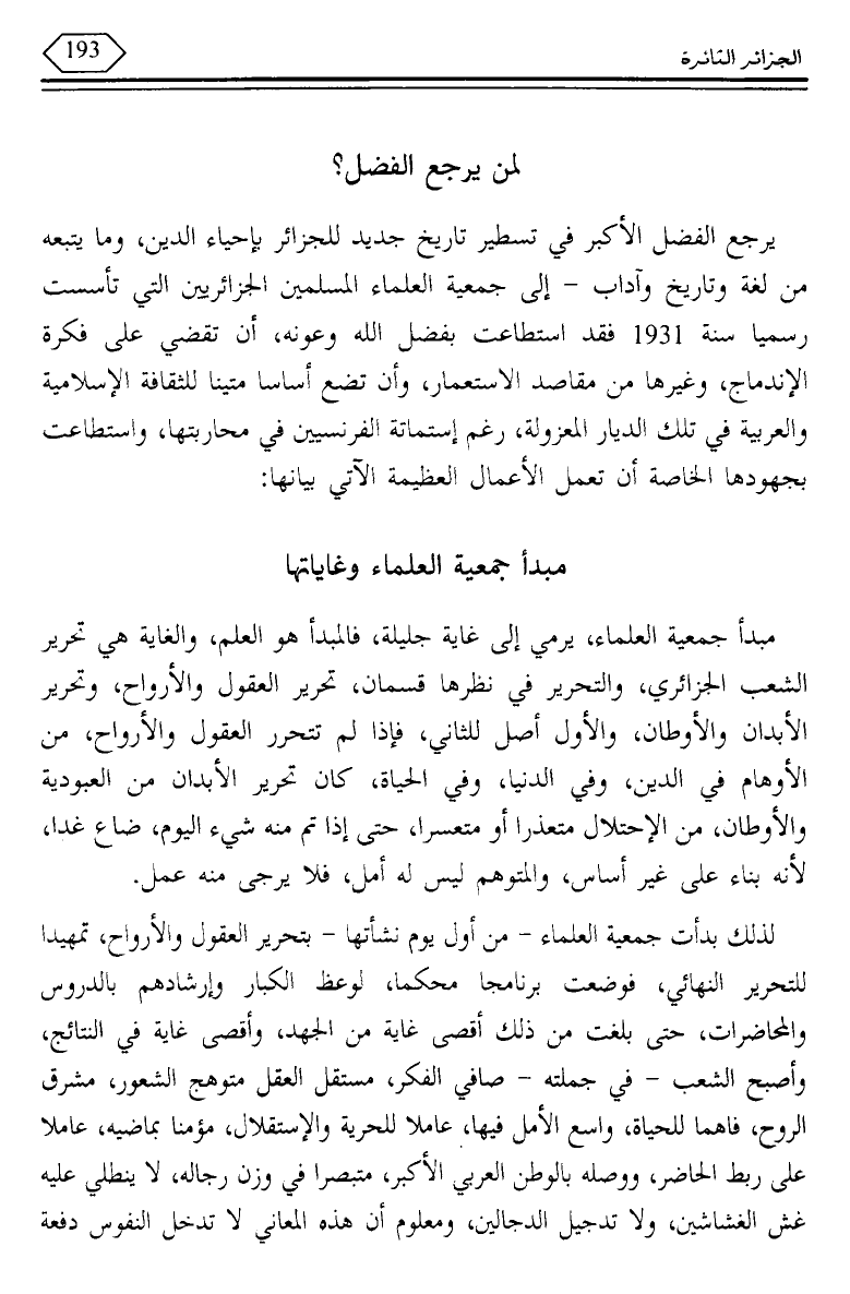 يرجع الفضل الأكبر في تسطير تاريخ جديد للجزائر بإحياء الدين، وما يتبعه من لغة وتاريخ وآداب - إلى جمعية العلماء المسلمين الجزائريين التي تأسست رسميا سنة 1931 فقد استطاعت بفضل الله وعونه، أن تقضى على فكرة الاندماج، وغيرها من مقاصد الاستعمار، وأن تضع أساسا متينا للثقافة الإسلامية والعربية في تلك الديار المعزولة، رغم استماتة الفرنسيين في محاربتها، واستطاعت بجهودها الخاصة أن تعمل الأعمال العظيمة الآتي بيانها: