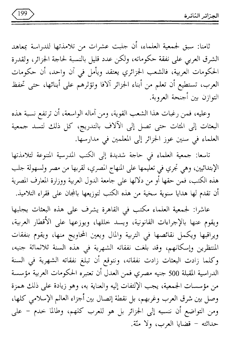 ثامنا: سبق لجمعية العلماء، أن جلبت عشرات من تلامذتها للدراسة بمعاهد الشرق العربي على نفقة حكوماته، ولكن عدد قليل بالنسبة لحاجة الجزائر، ولقدرة الحكومات العربية، فالشعب الجزائري يعتقد ويأمل, في آن واحد، أن حكومات العرب، تستطيع أن تعلم من أبناء الجزائر آلافا وتؤثرهم على أبنائها، حتى تحفظ التوازن بين أجنحة العروبة.
