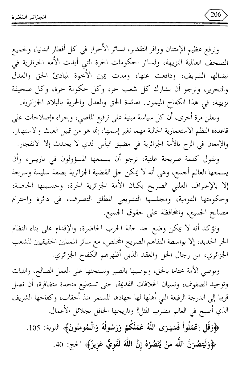 والتحرير، ونرجو أن يشارك كل شعب حر، وكل حكومة حرة، وكل صحيفة نزيهة، في هذا الكفاح الميمون. لفائدة الحق والعدل والحرية بالبلاد الجزائرية.