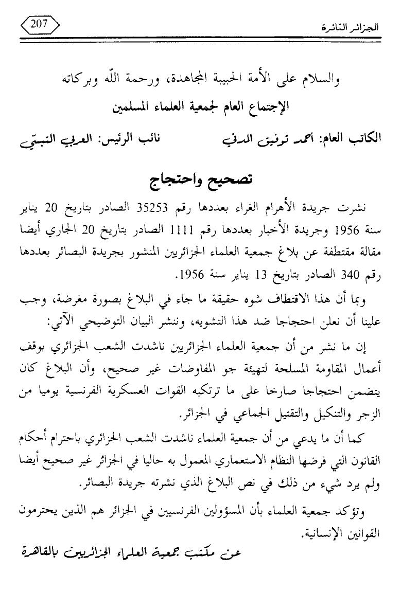 إن ما نشر من أن جمعية العلماء الجزائريين ناشدت الشعب الجزائري بوقف أعمال المقاومة المسلحة لتهيئه جو المفاوضات غير صحيح، وأن البلاغ كان يتضمن احتجاجا صارخا على ما ترتكبه القوات العسكرية الفرنسية يوميا من